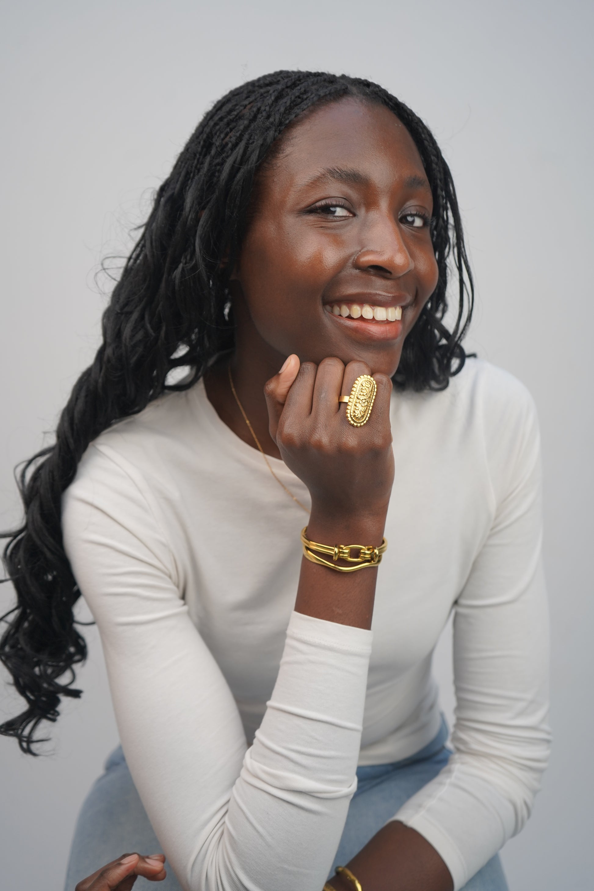 Oriana's infinity bangle is a thick gold bangle with a beautiful knot detail at the center. This piece goes with everything and is the perfect elegant piece to add to your everyday stack.
