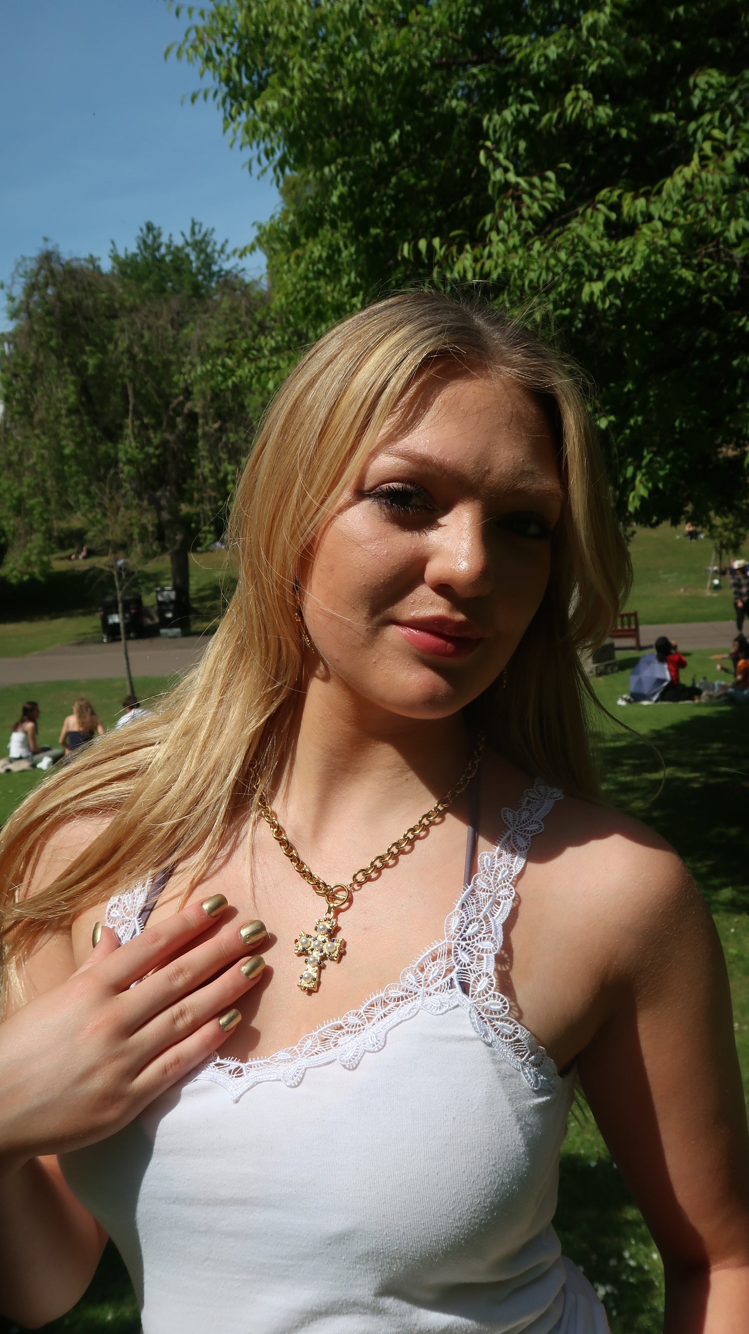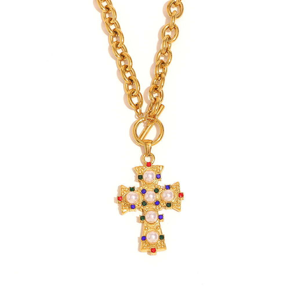 Oria's Cross Necklace features a gold cross pendant adorned with pearls and colourful gemstones, set on a chunky chain. This necklace is a bold, vintage-inspired piece that makes a statement with any outfit.