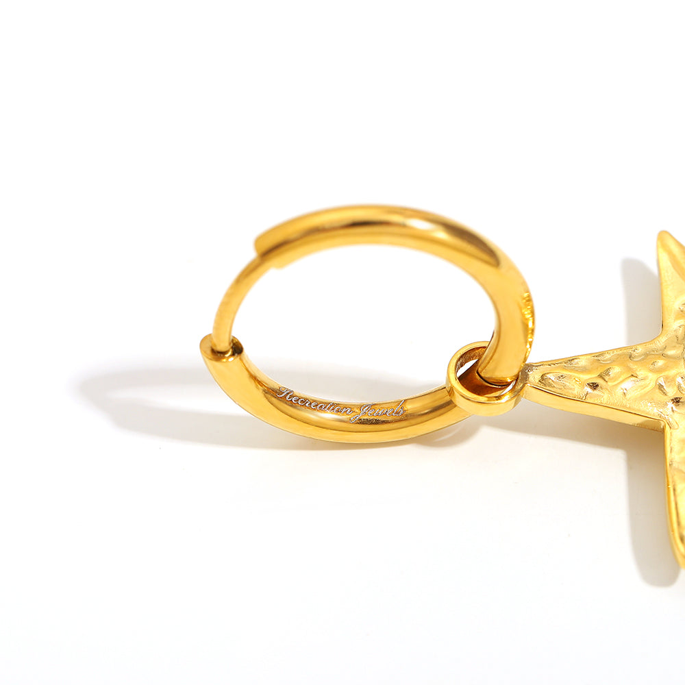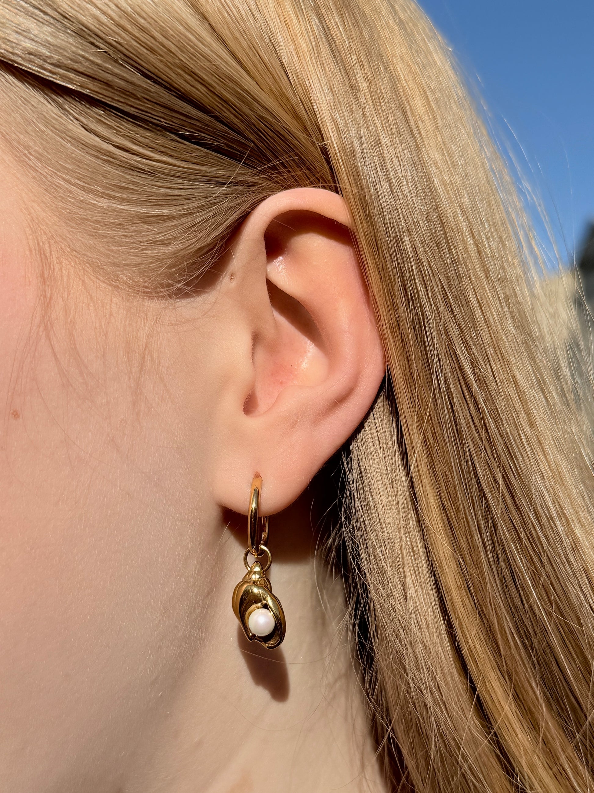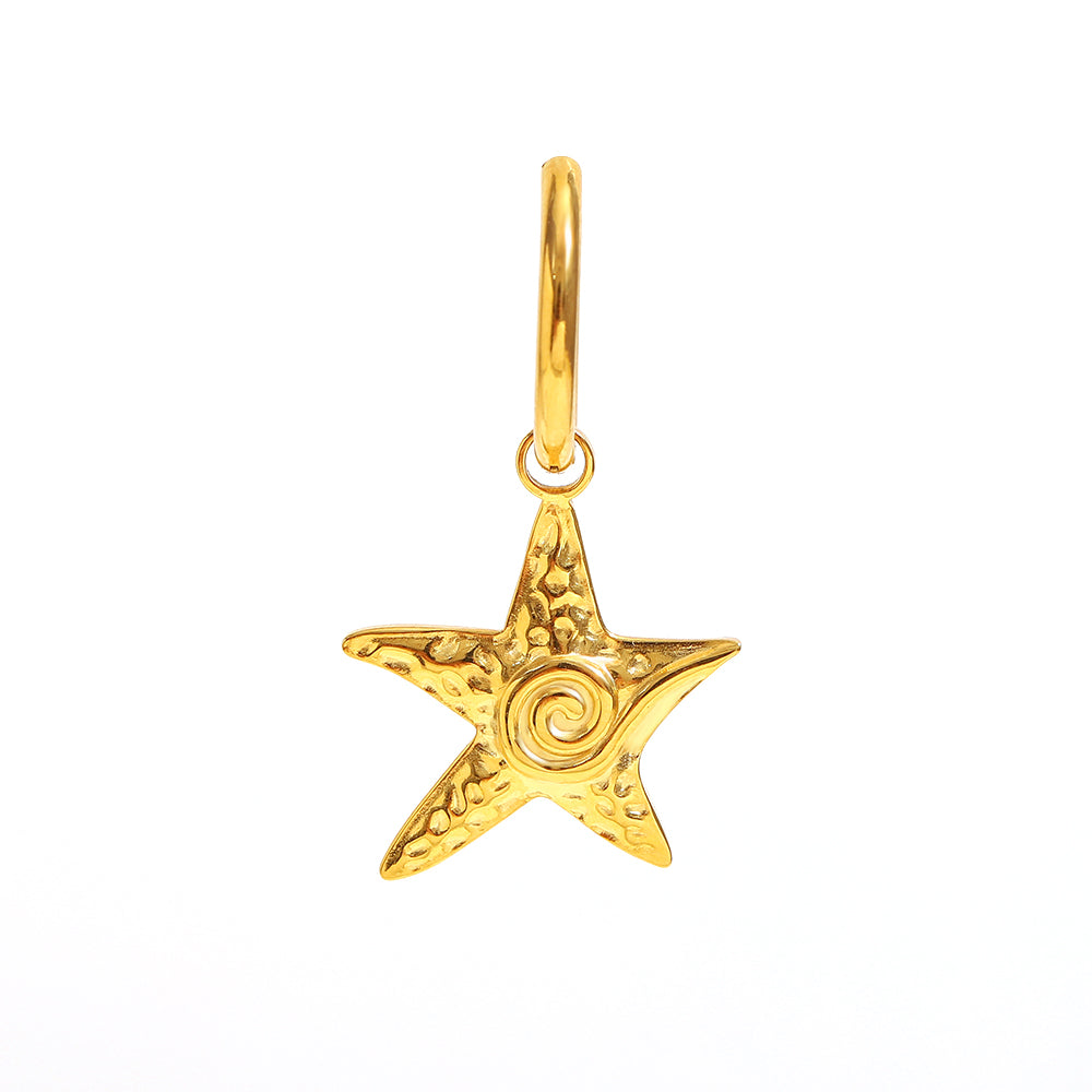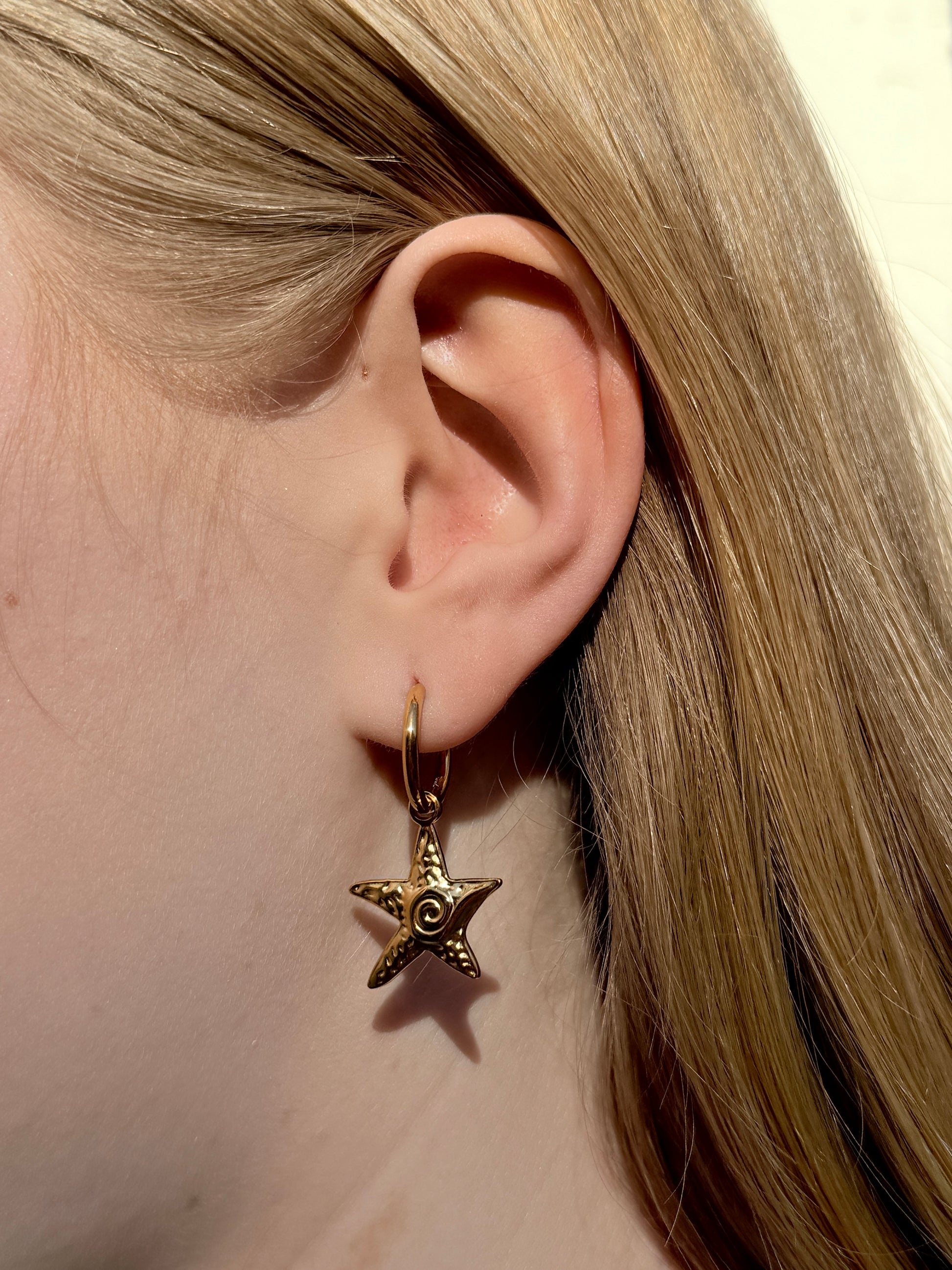 Otilia’s Starfish Hoops are gold huggie earrings featuring a textured starfish charm and a pearl nestled inside a mini shell. Inspired by seaside treasures, these hoops add a playful, beachy touch to any outfit.