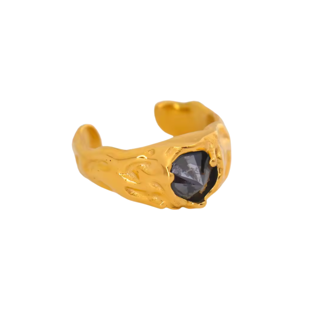 Paige's gemstone ring features a textured gold band and a dark gemstone at the center. This unique, simple, and elegant ring makes the perfect addition to any stack.