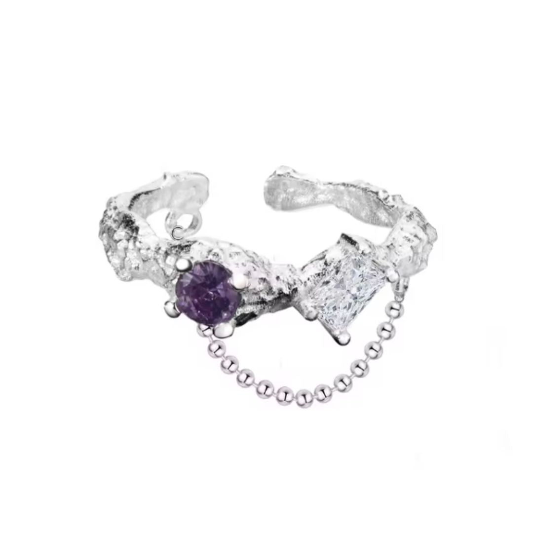 A textured silver-tone cuff accented with a delicate chain and black and clear gemstones.