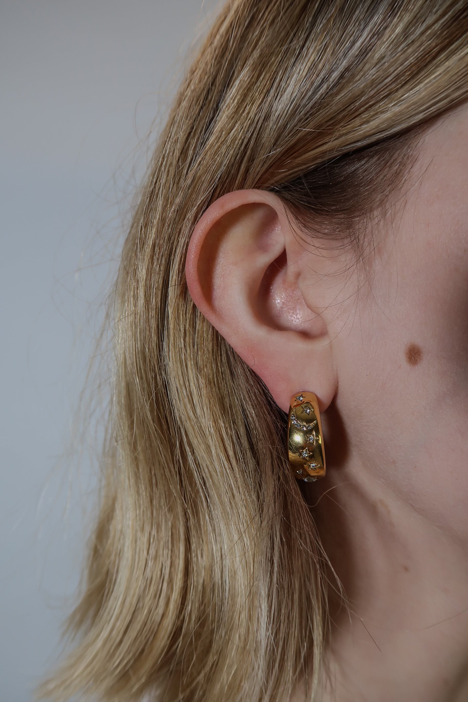 Petra’s star hoops are chunky hoop earrings with intricate sun, star, and moon gemstone details.