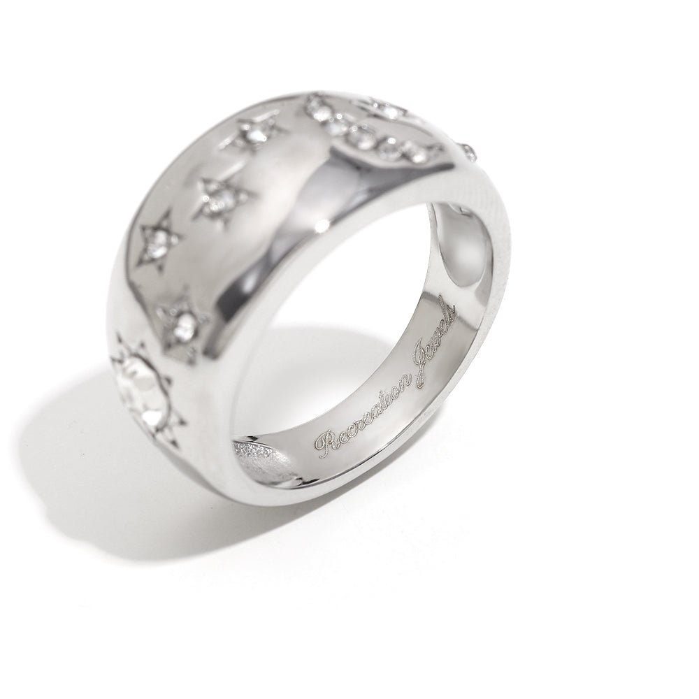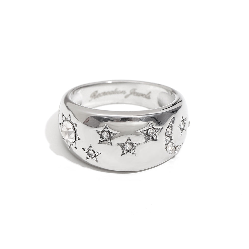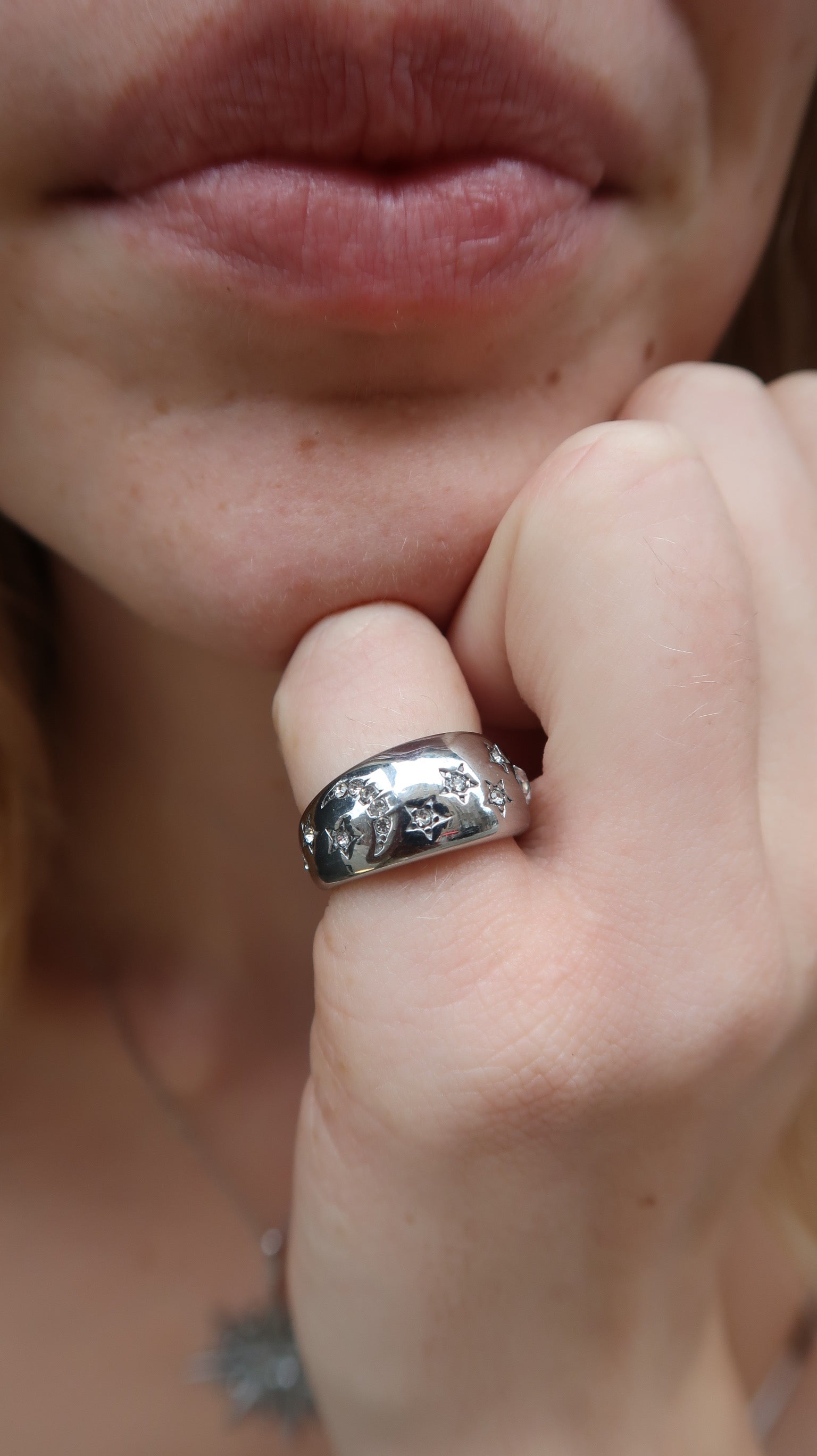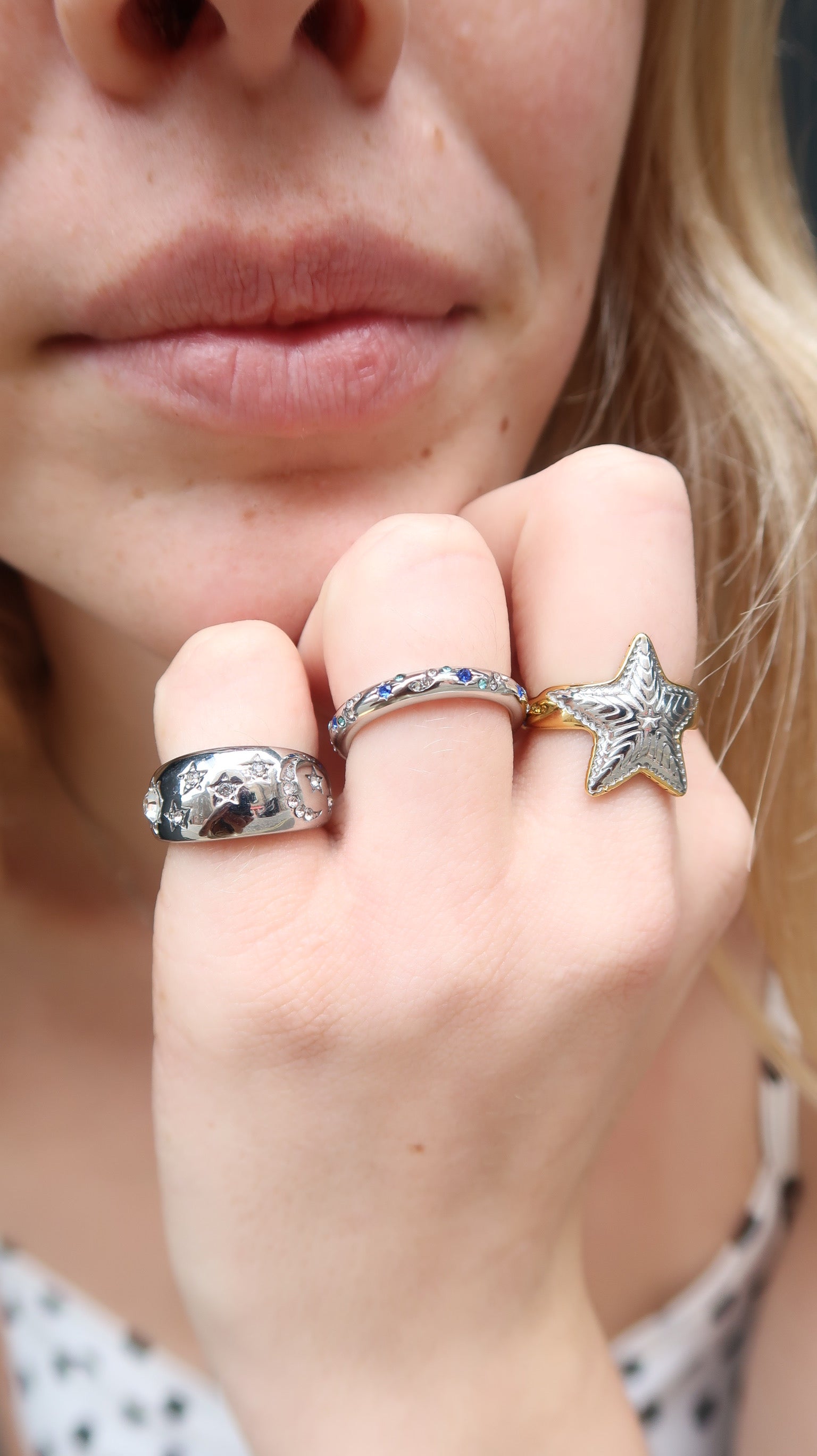 Petra’s star ring is a chunky silver ring with sun star and moon gemstone detailing. This ring is simple yet intricate, and is perfect to pair with other rings or wear by itself.