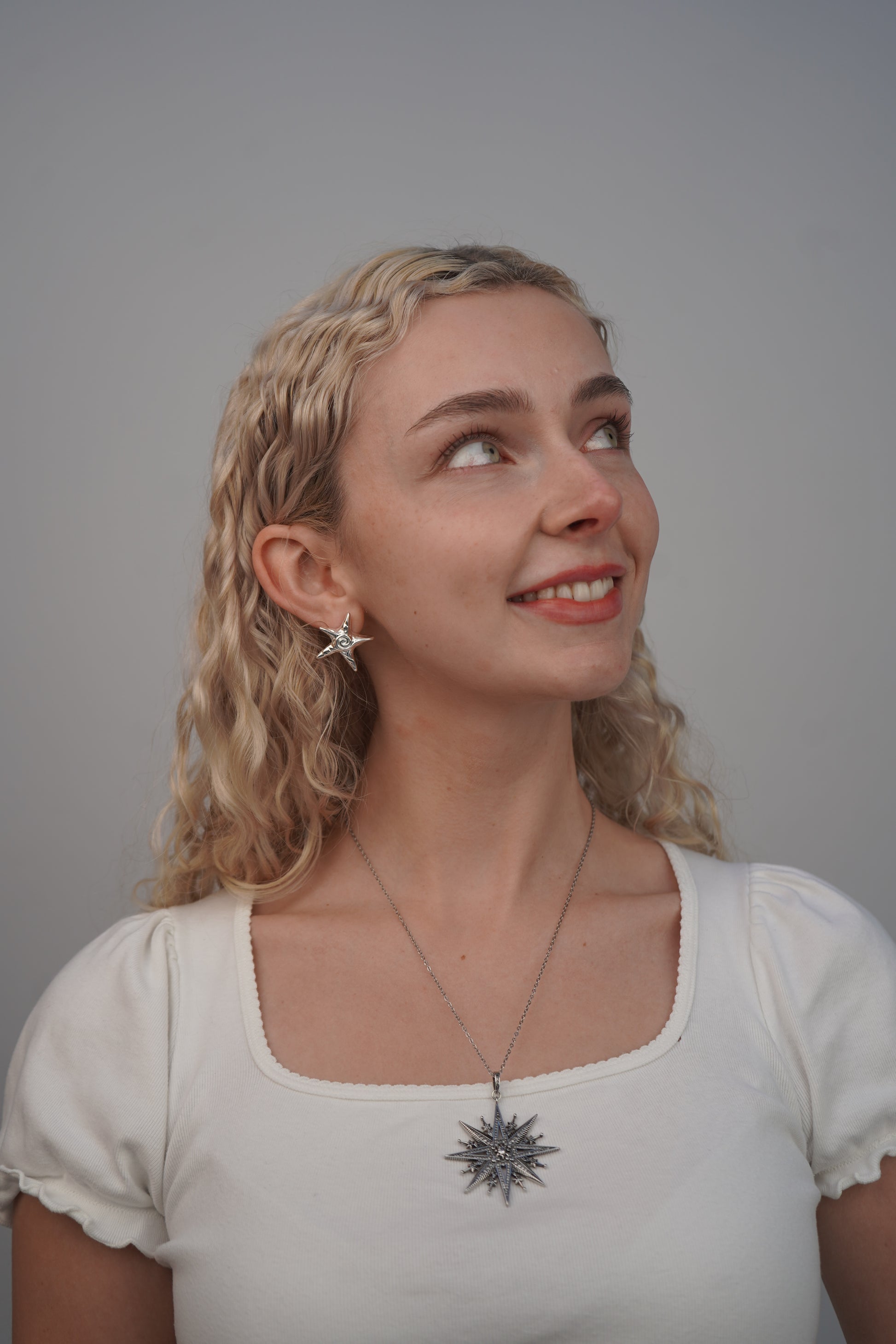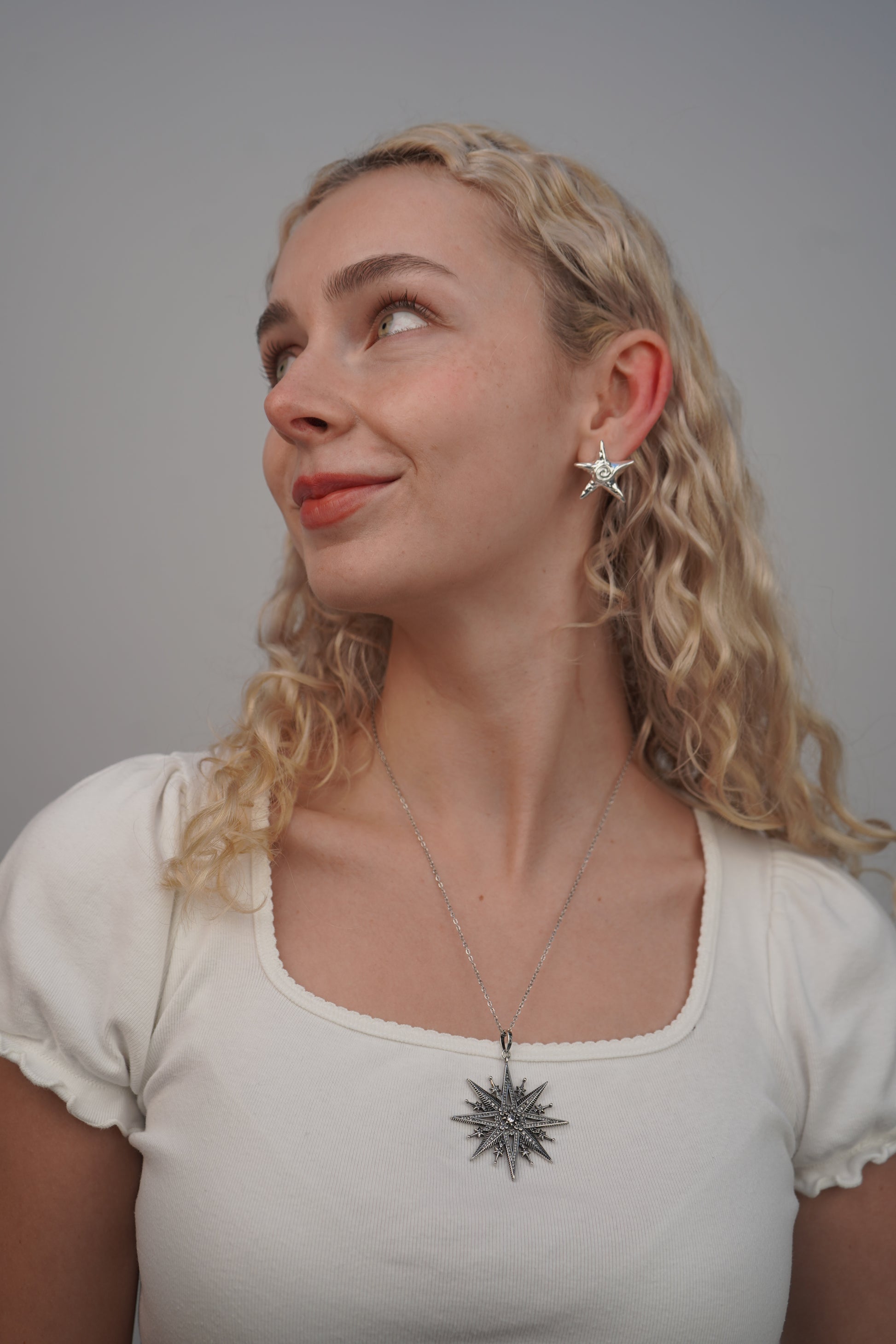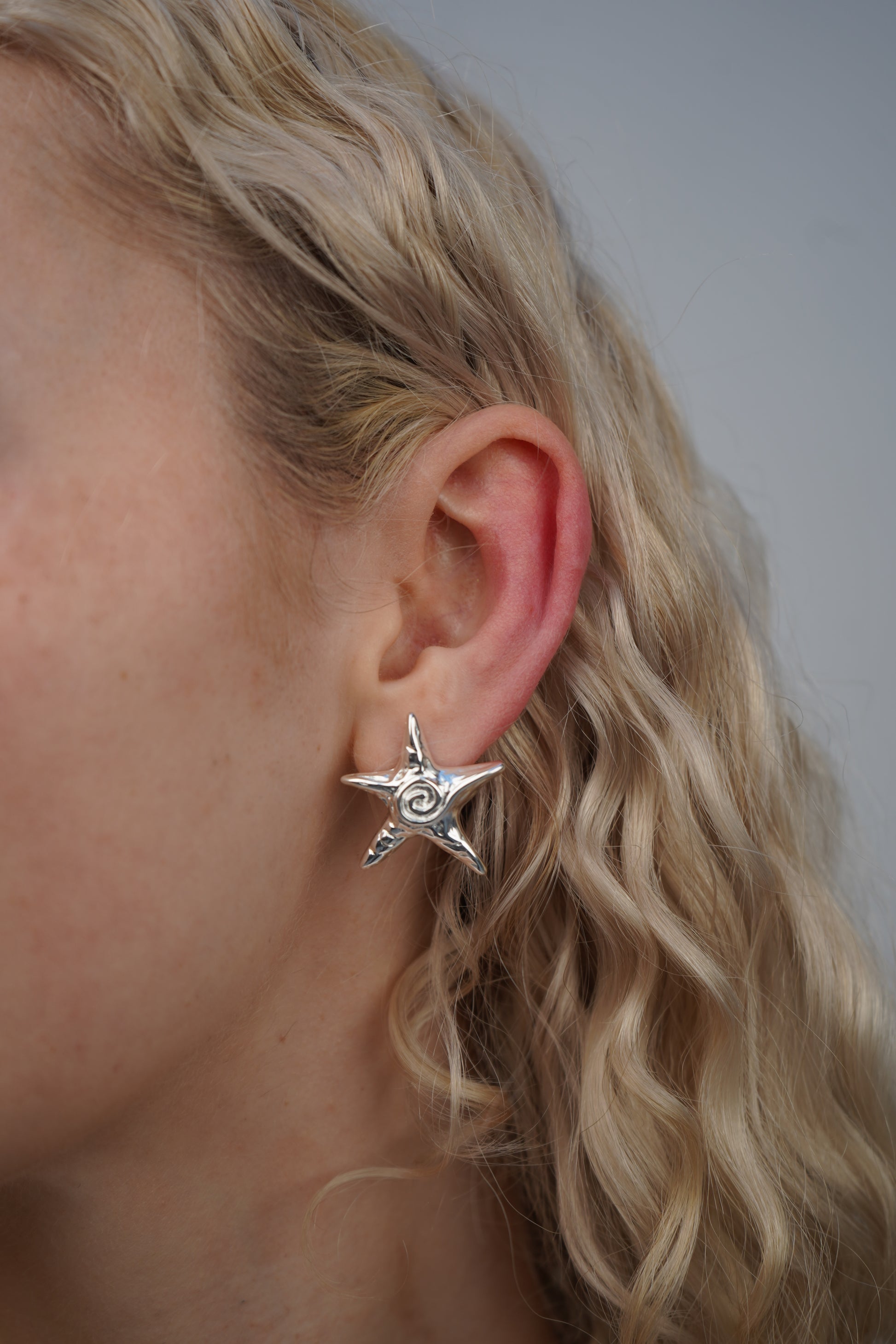 Pia's starfish earrings in silver are small starfish-shaped stud earrings with swirl detailing at the center. These earrings are the perfect mix of elegant and playful so they can be worn with any style.