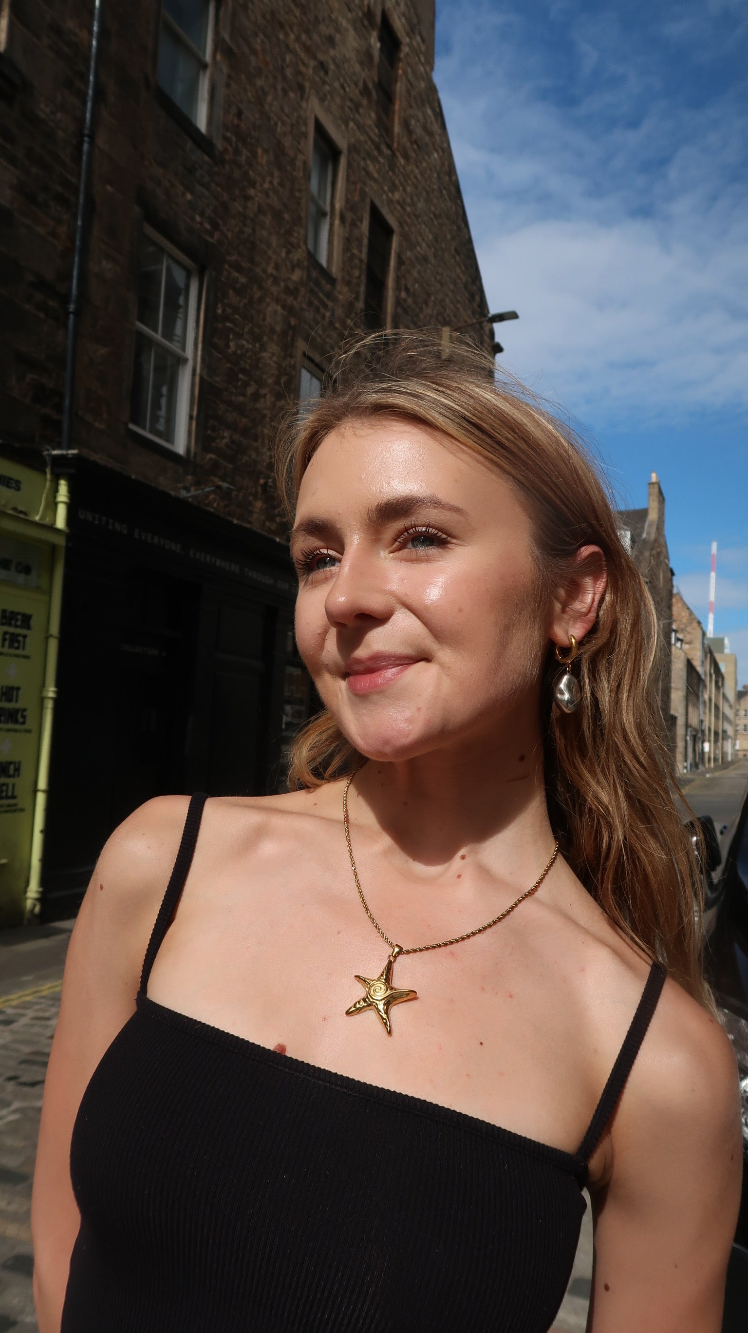 Pia's Starfish Necklace is a gold starfish-shaped pendant featuring an elegant swirl design at the center. This necklace makes the perfect statement piece for any occasion.