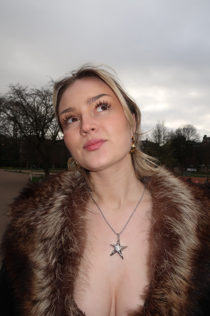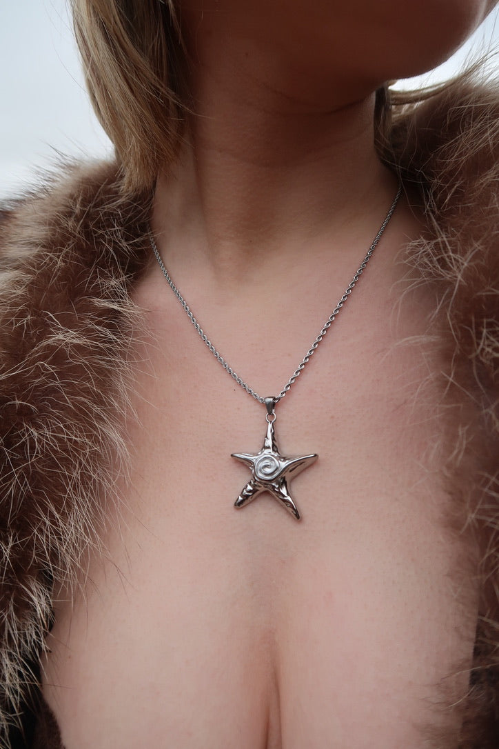 Pia's Starfish Necklace is a silver starfish-shaped pendant featuring an elegant swirl design at the center. This necklace makes the perfect statement piece for any occasion.