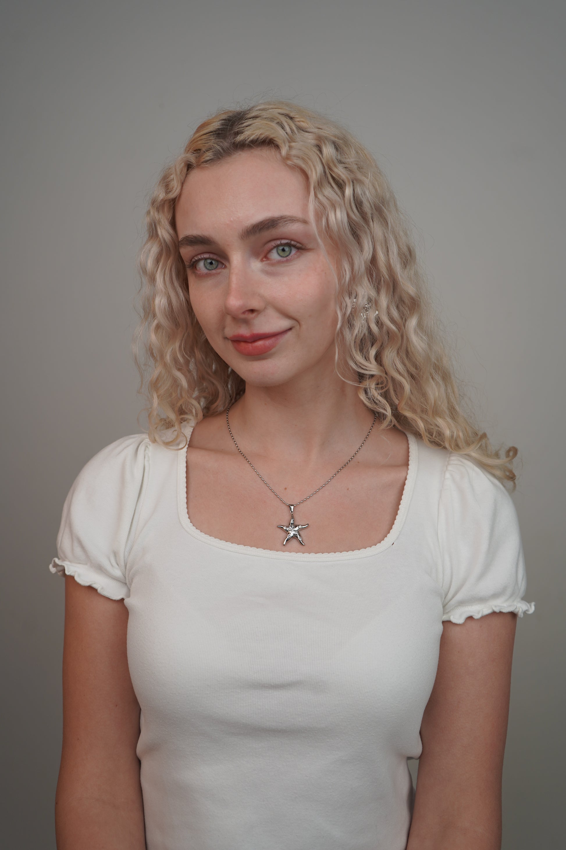 Pim's starfish necklace features a beautifully textured silver starfish pendant adorned with shimmering white zircon stones. This is the perfect necklace to add a summery touch to any look.