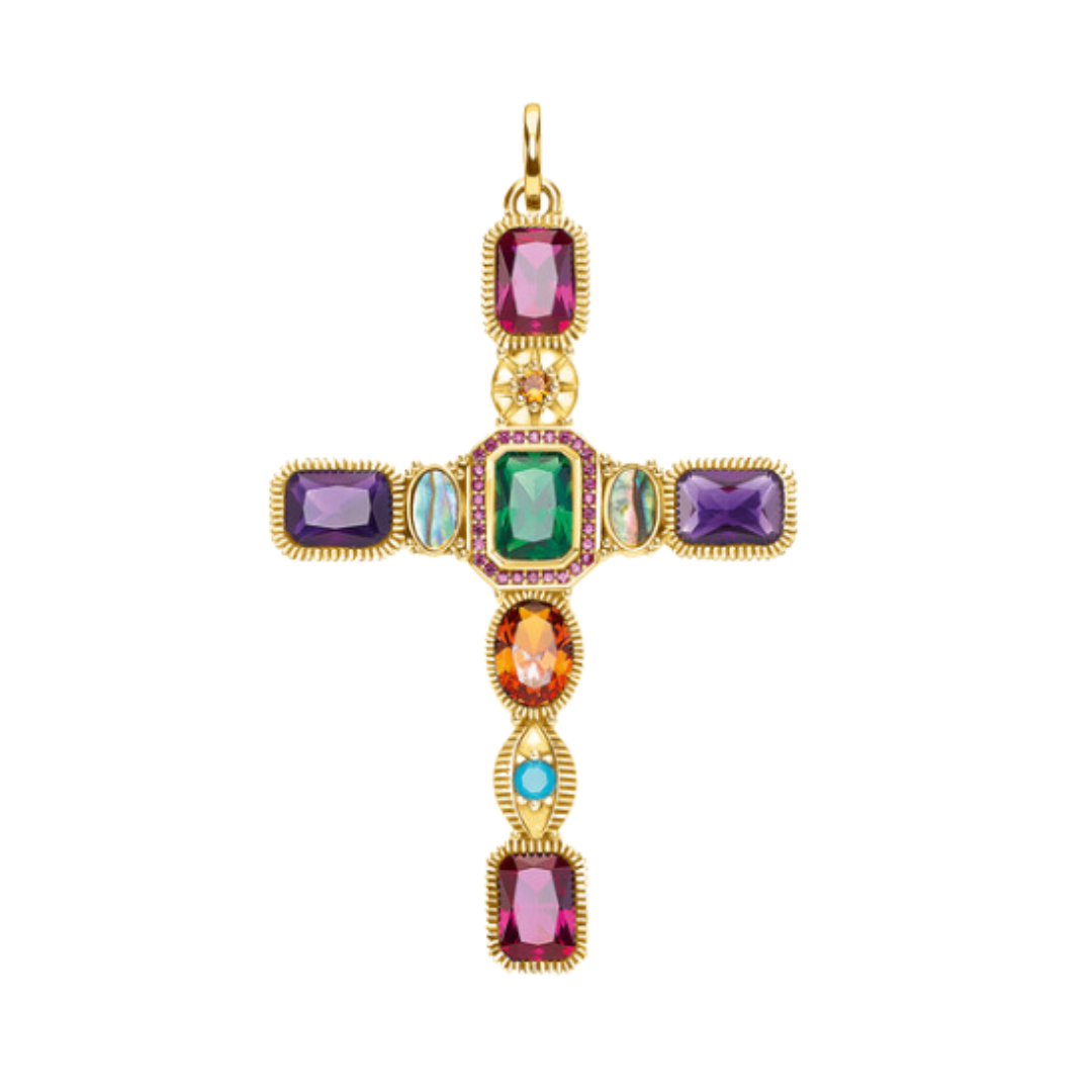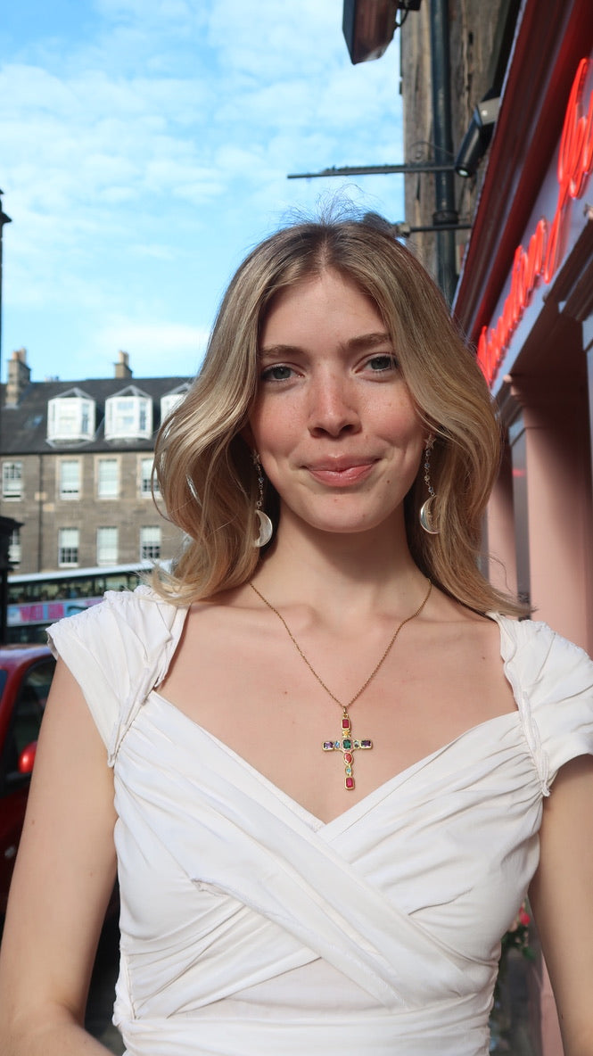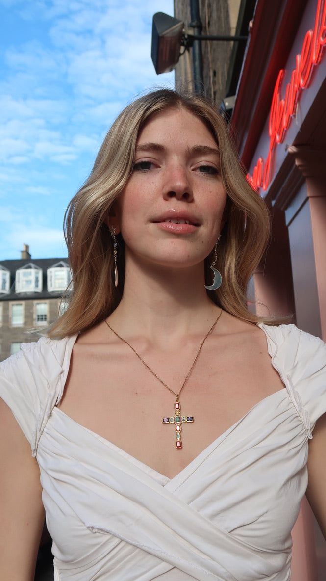 Ranee's Colorful Cross Necklace is a vintage-inspired statement piece. This cross-shaped pendant features bright purple, pink, orange, green, and blue gemstones. This is the perfect maximalist statement piece to elevate any look.