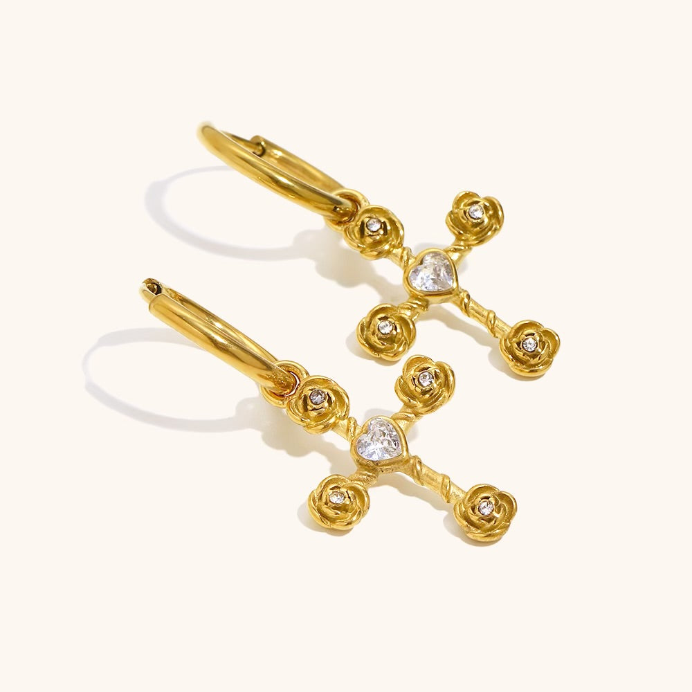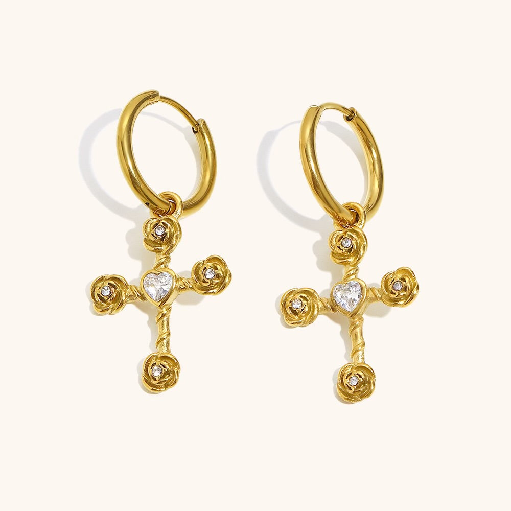 Rosie's cross huggies are small hoop earrings with an intricate cross charm featuring delicate white gemstone accents. These are lightweight and versatile, perfect for any occasion.