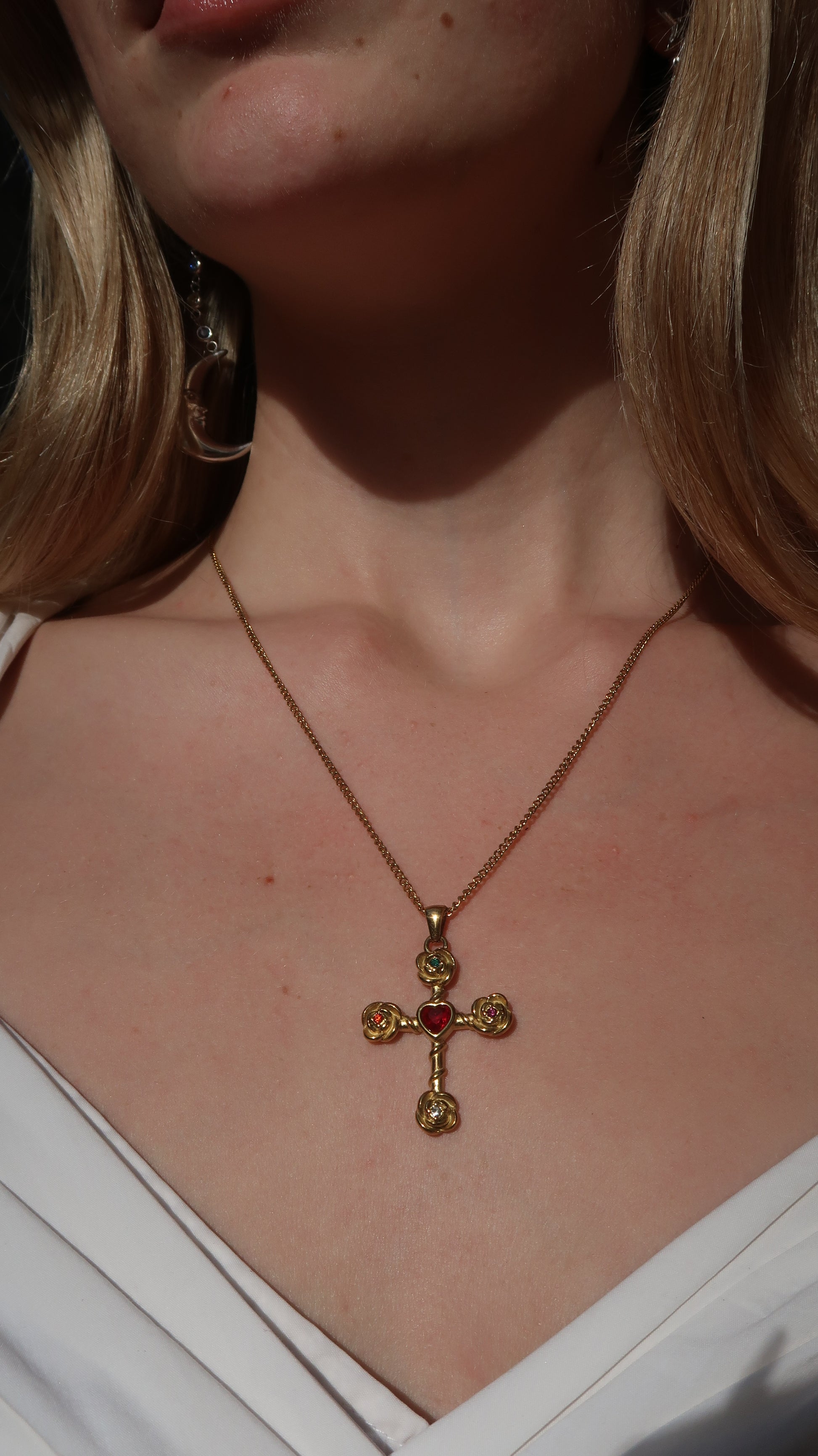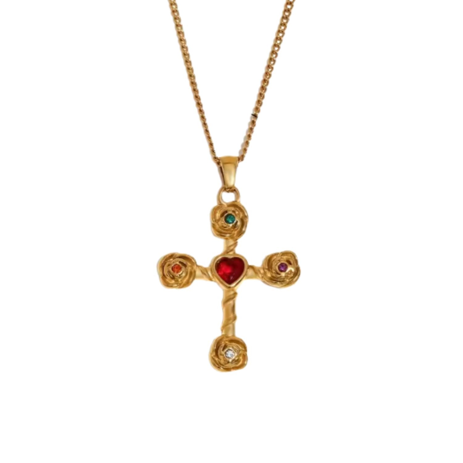 Rosie's cross necklace is a beautifully textured gold cross pendant, accented with vibrant multicolored gemstones and a striking red heart centerpiece. This piece is perfect for maximalist layering, or on its own as a statement piece.