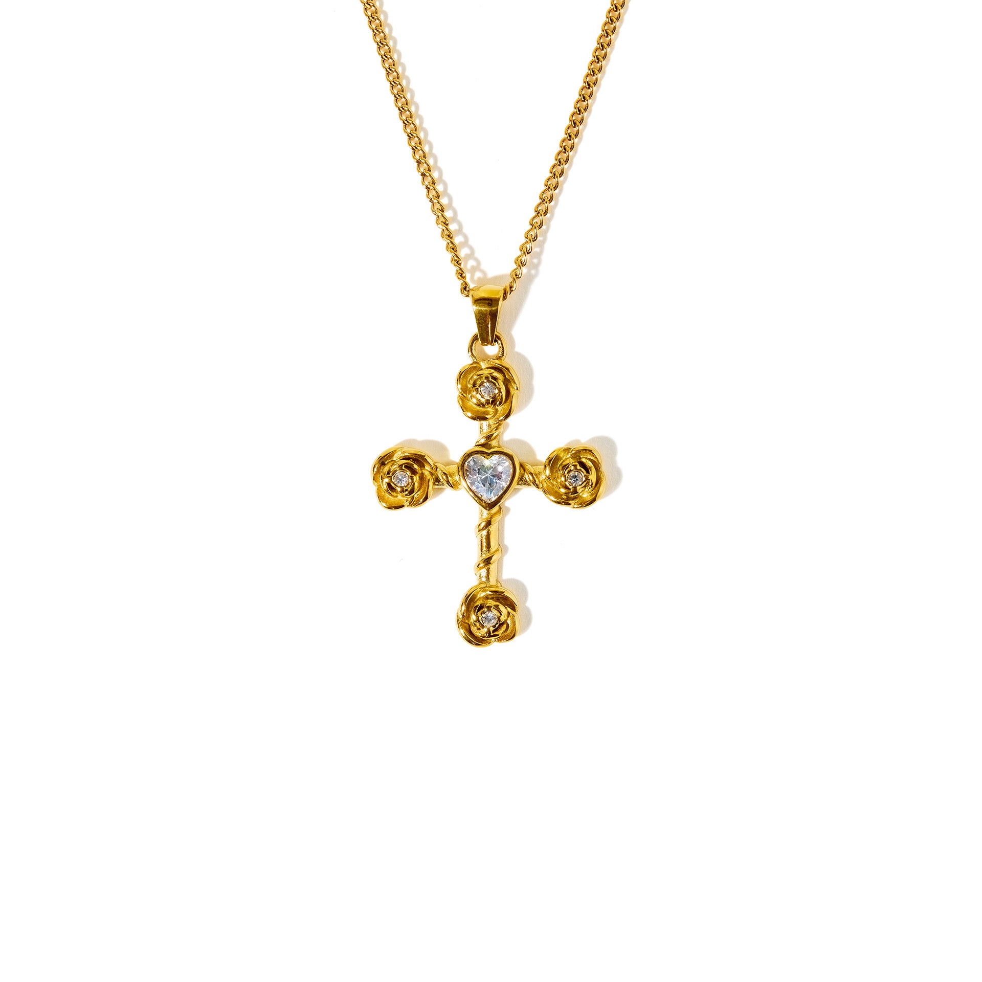 Rosie's white cross necklace is a beautifully textured gold cross pendant, accented with vibrant multicolored gemstones and a striking red heart centerpiece. This piece is perfect for maximalist layering, or on its own as a statement piece.