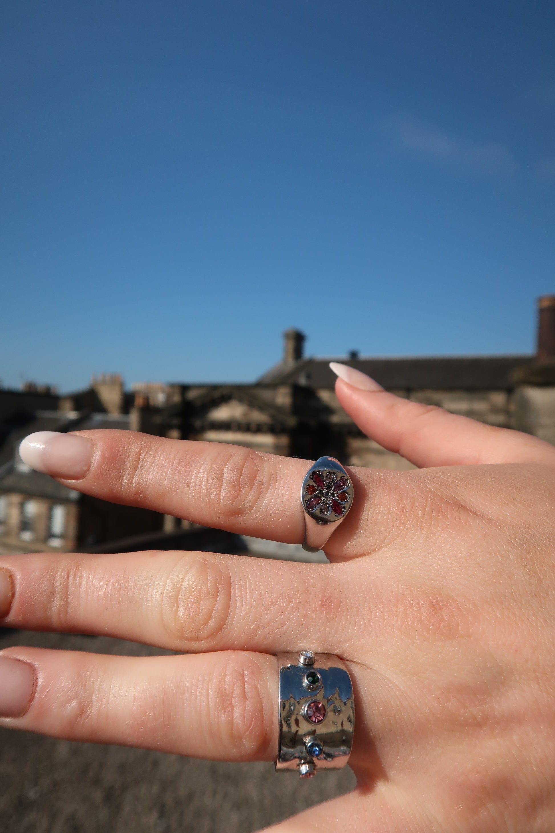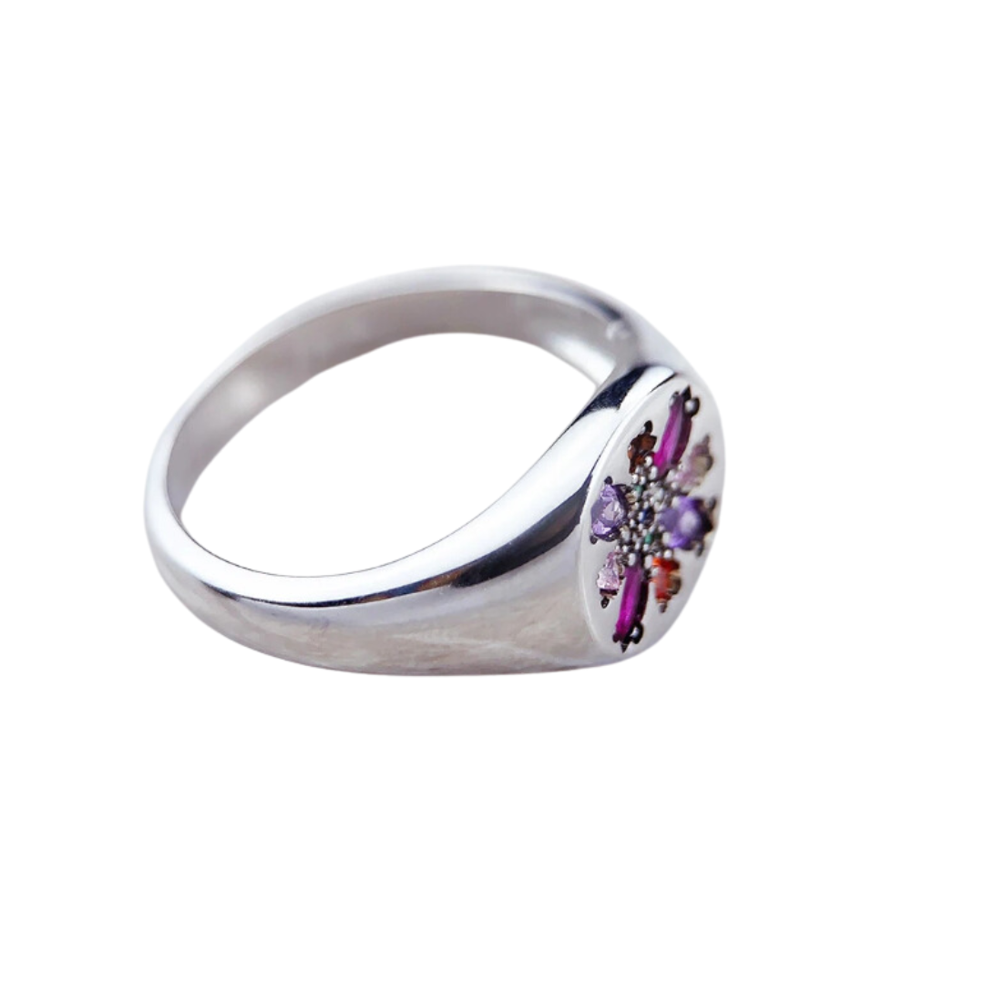 Ruby's Signet Ring in silver is an elegant silver signet ring that features an array of pink, blue, and orange gemstones. This piece is the perfect understated statement piece to wear by itself or stack with other rings.