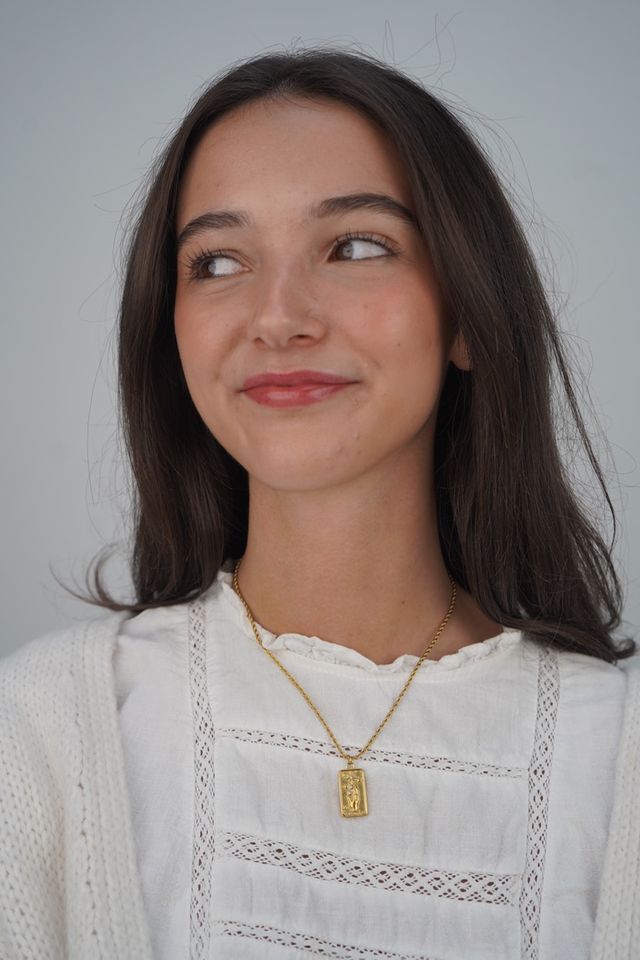 Sanah’s Star Necklace features a gold pendant with a celestial tarot card design, including a hand reaching for the stars. Sparkling zircon stones add a subtle shine, giving this piece a polished, high-end look.