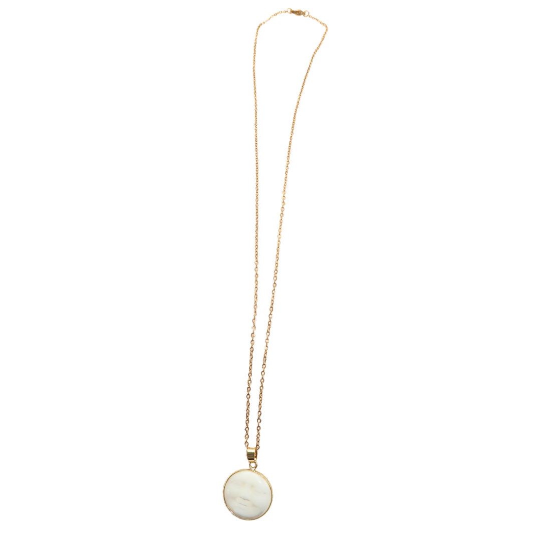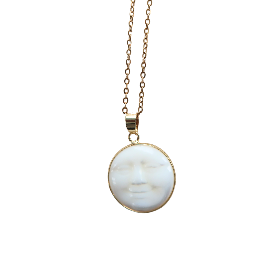 Sareen's Moon Necklace features a stunning white moon pendant. This simple piece is perfect for layering, or worn on its own for an understated and elegant look.