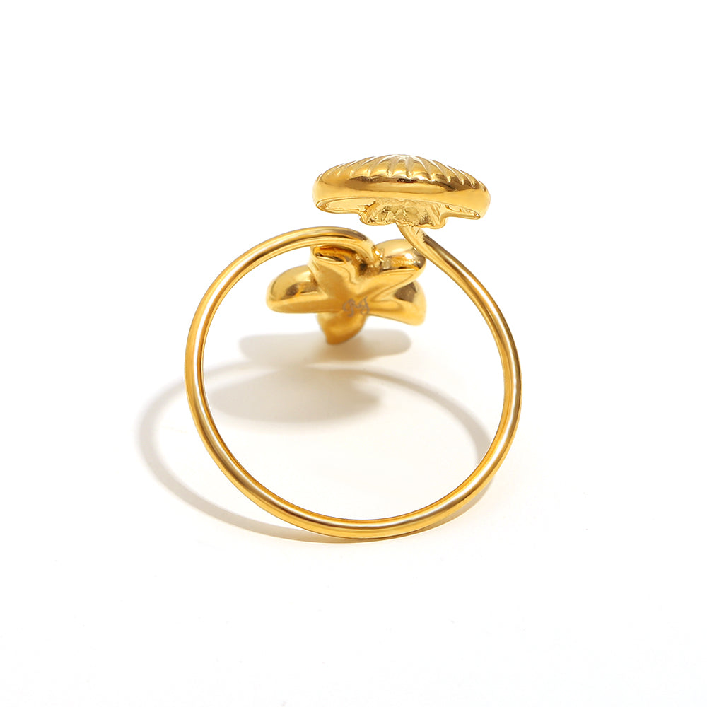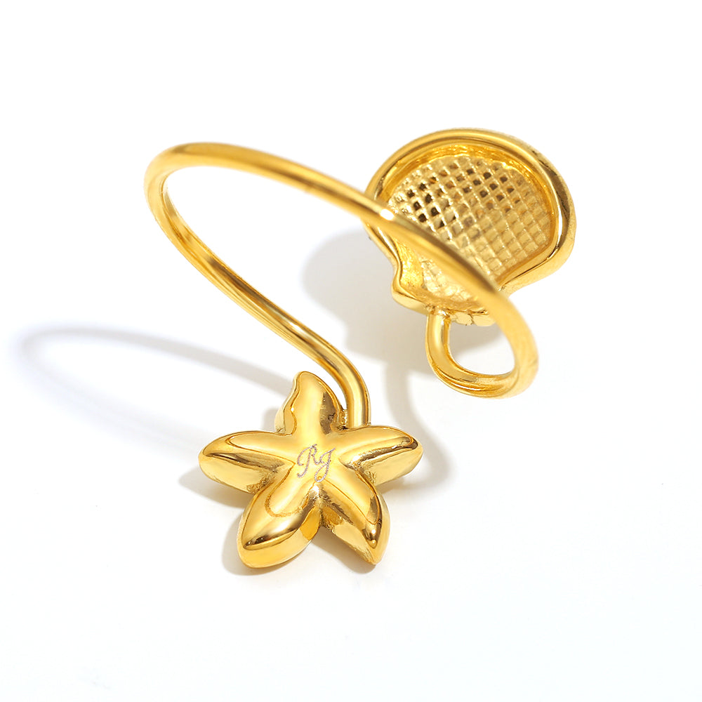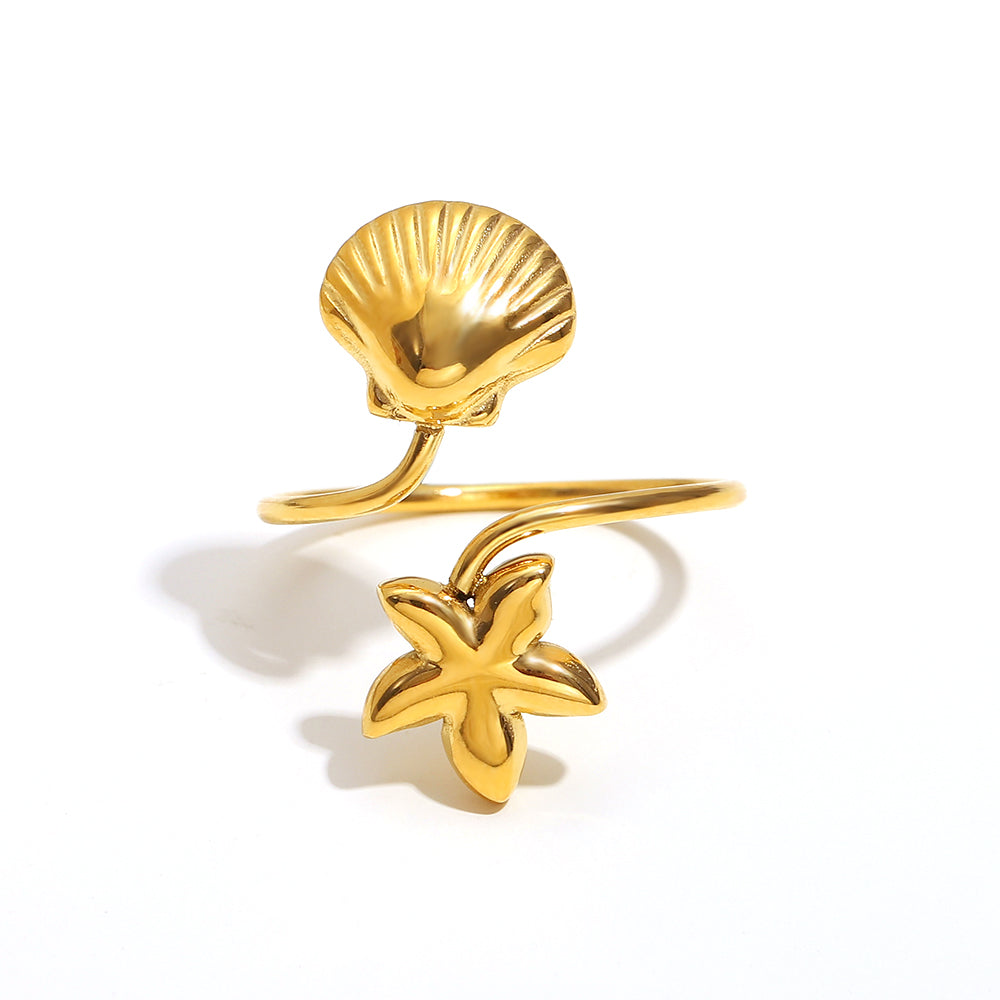 Inspired by treasures from the sea, the Sirena Ring wraps delicately around the finger with a sculptural starfish and seashell design. Its open band style makes it fully adjustable, while the glossy gold finish adds a bold but wearable edge.