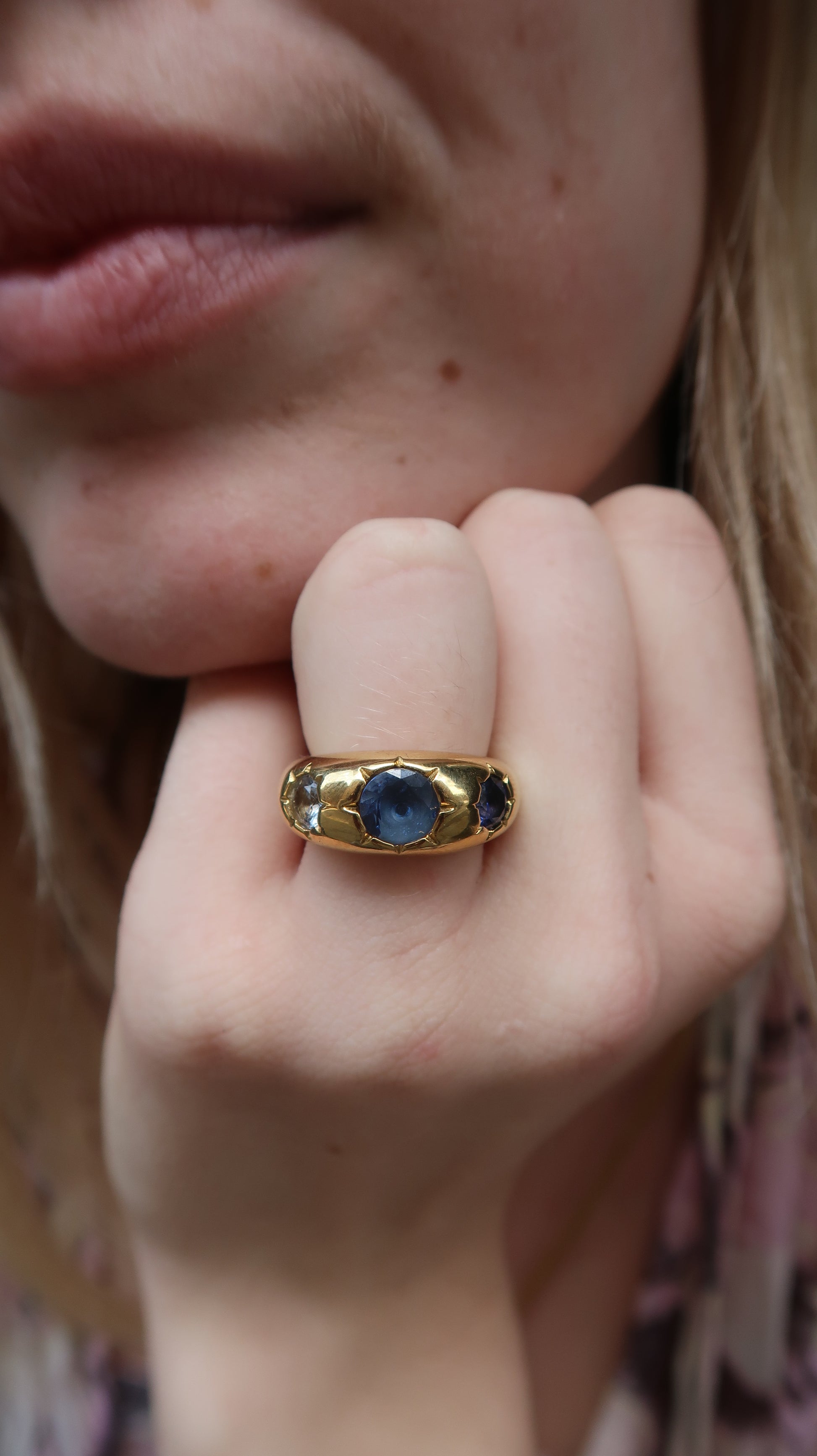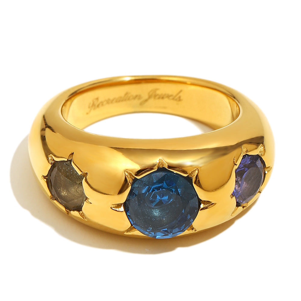 Sophie's blue gemstone ring is a chunky gold ring with three large gemstones with star detailing. It features a bright blue gemstone at the center, a light blue gemstone on one side, and a clear gemstone on the other side. This is the perfect maximalist ring to add to your everyday stack.