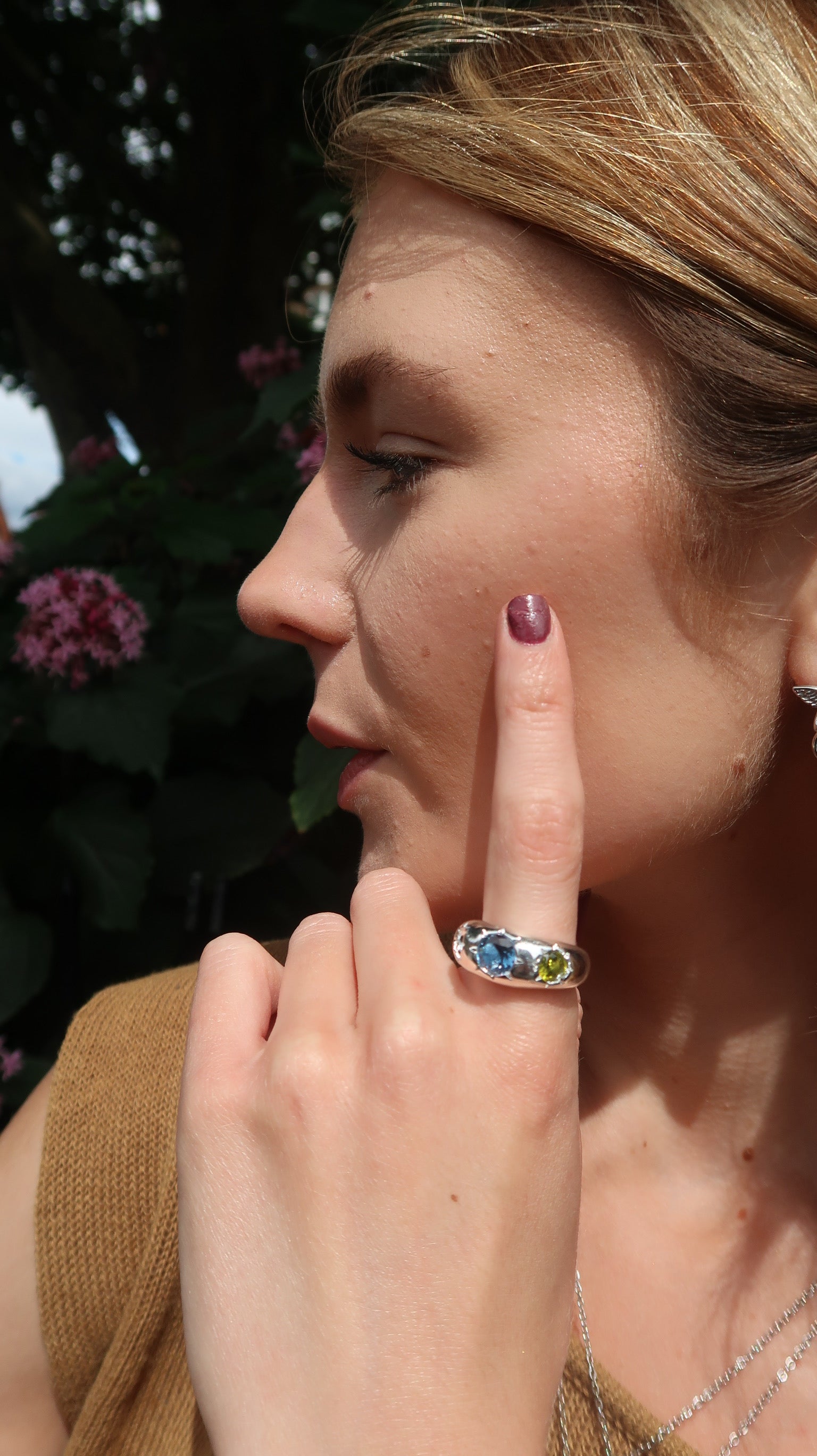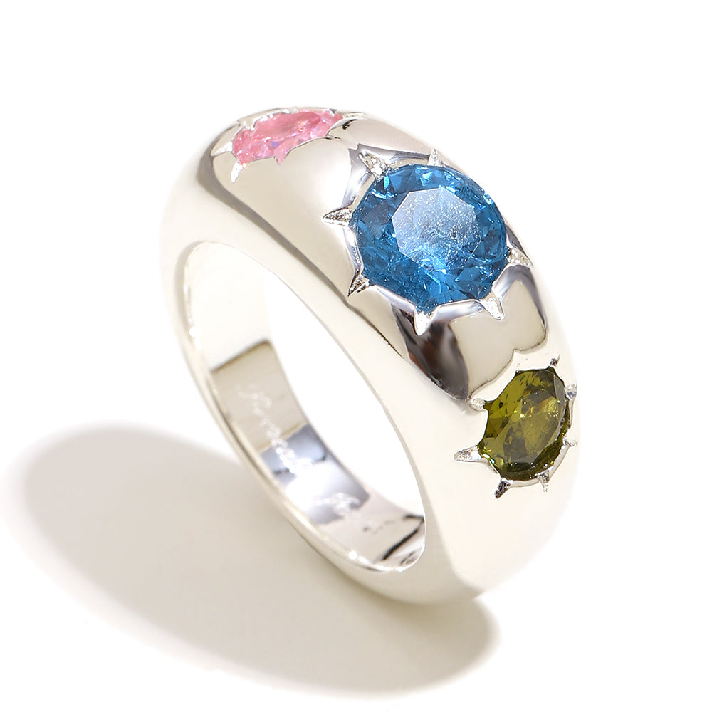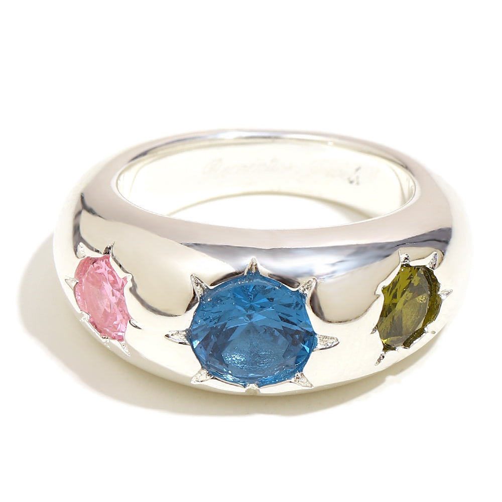 Sophie's gemstone ring in silver is a chunky silver ring with three large gemstones with star detailing. It features a bright blue gemstone at the center, a light pink gemstone on one side, and a green gemstone on the other side. This is the perfect maximalist ring to add to your everyday stack.