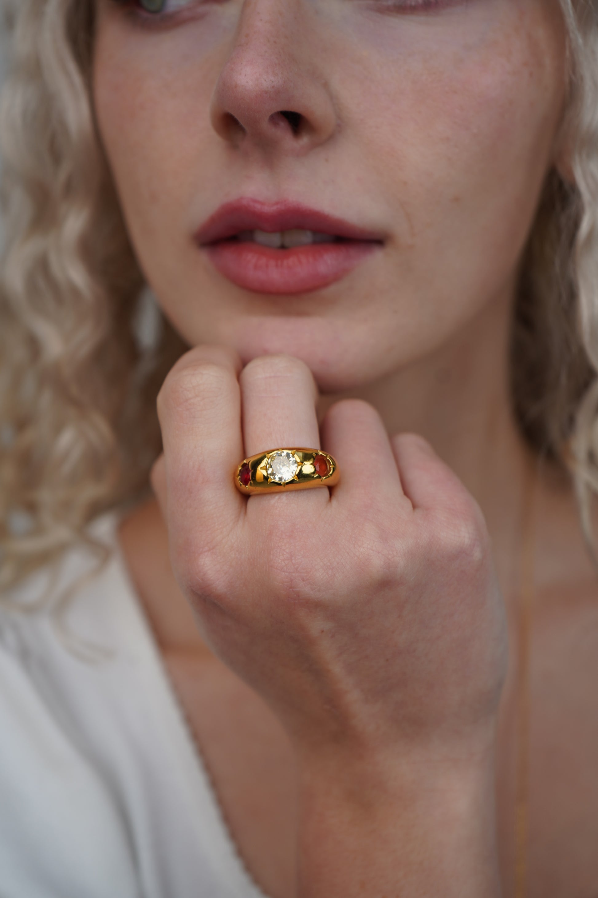 Sophie's red gemstone ring is a chunky gold ring with three large gemstones with star detailing. It features a bright white at the center, and red gemstones on either side. This is the perfect maximalist ring to add to your everyday stack.