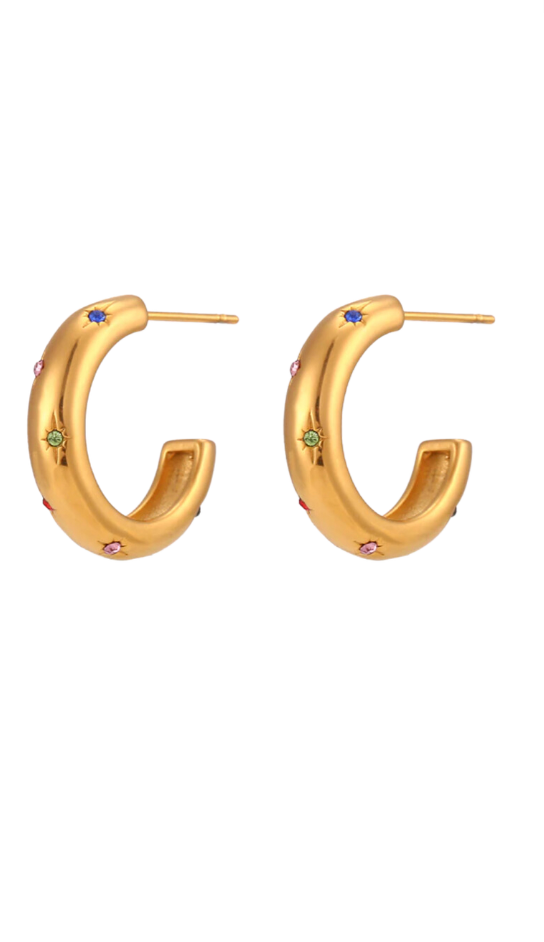 Sophie's star hoops are medium sized gold hoop earrings accented with brightly coloured gemstones and star engraving. These earrings are waterproof, hypoallergenic, and perfect for everyday wear.