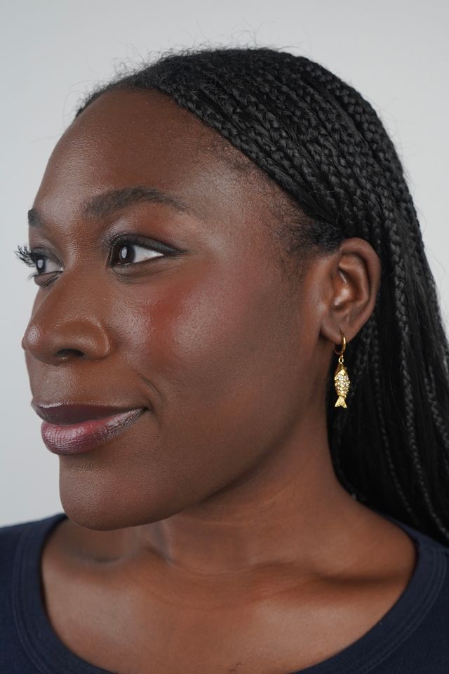 Stella’s Fish Hoops are a playful yet elegant take on seaside jewellery. Featuring a detailed gold fish charm encrusted with shimmering crystals, these statement hoops bring a little sparkle and whimsy to your everyday look.