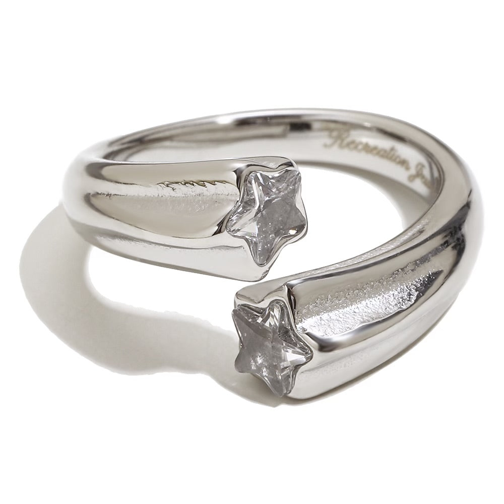 Susannah’s star ring in silver is a silver ring with an opened design and star shaped gemstone accents on each end. This is the perfect simple yet elegant ring to add to your daily stack.