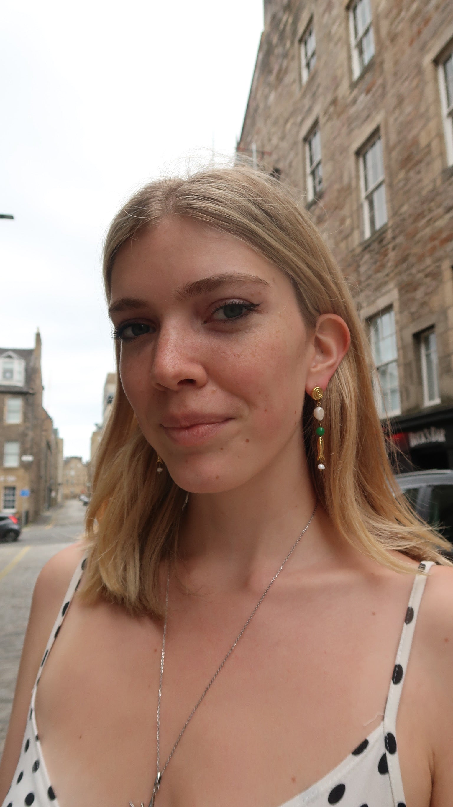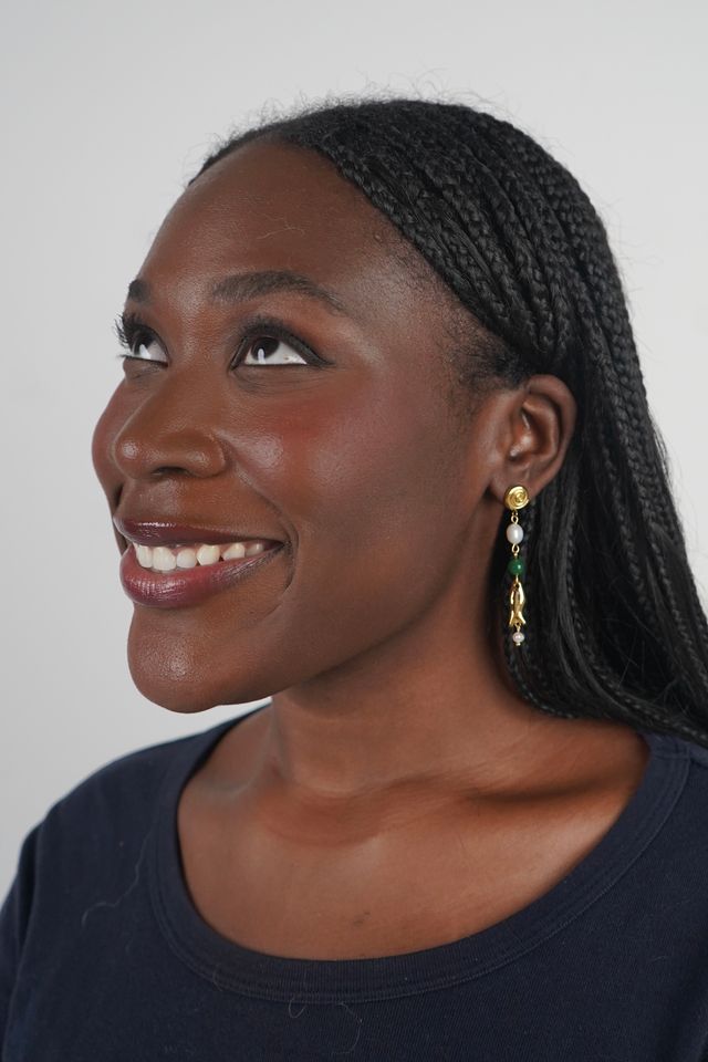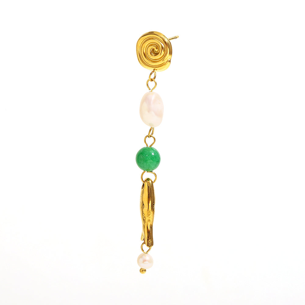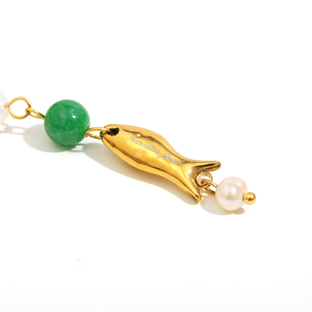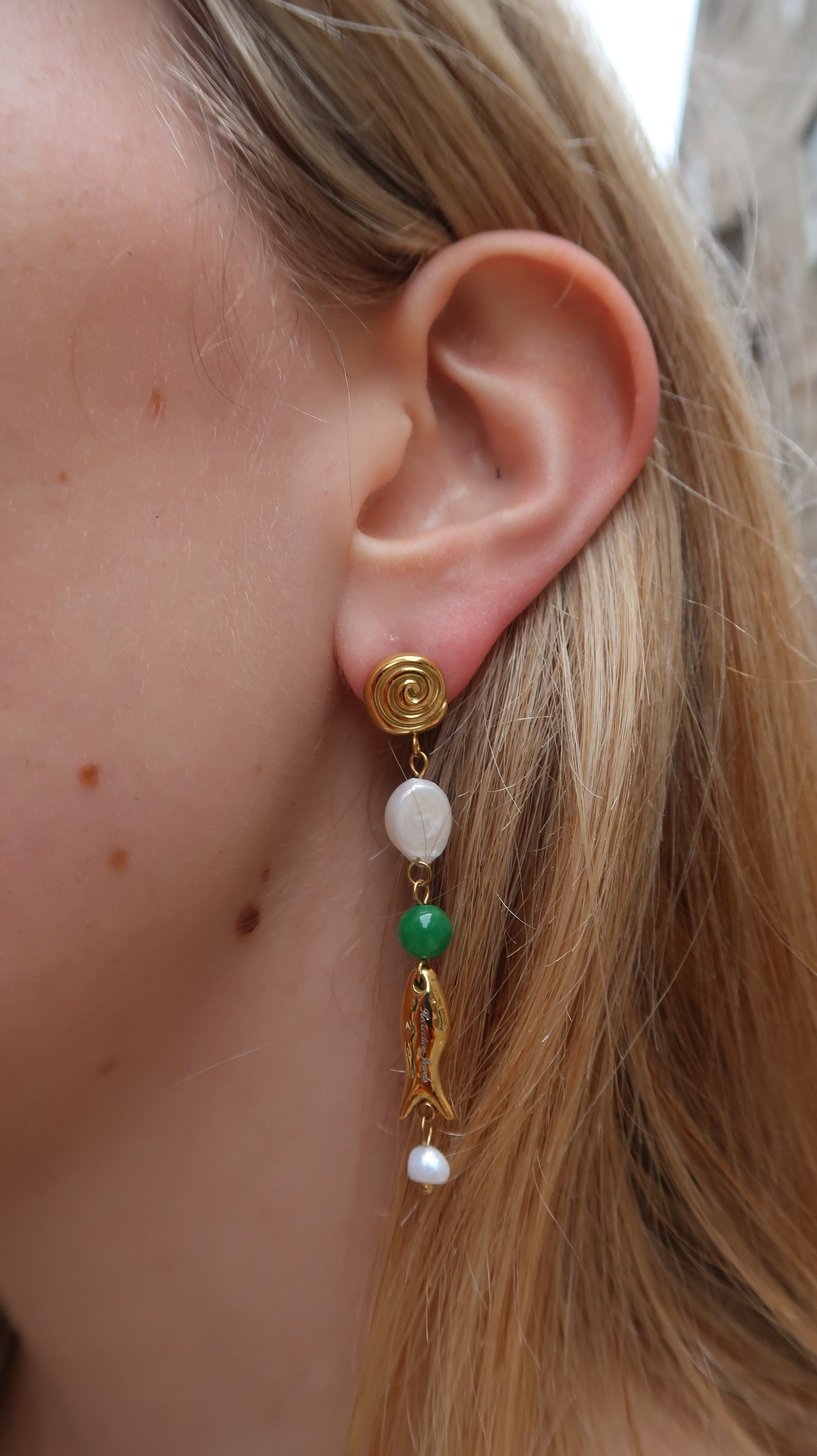 Tahlia's fish earrings are dangly earrings with a swirl stud, pearl and green accent beads, and gold fish detailing. These are the perfect elegant earrings to elevate any look.