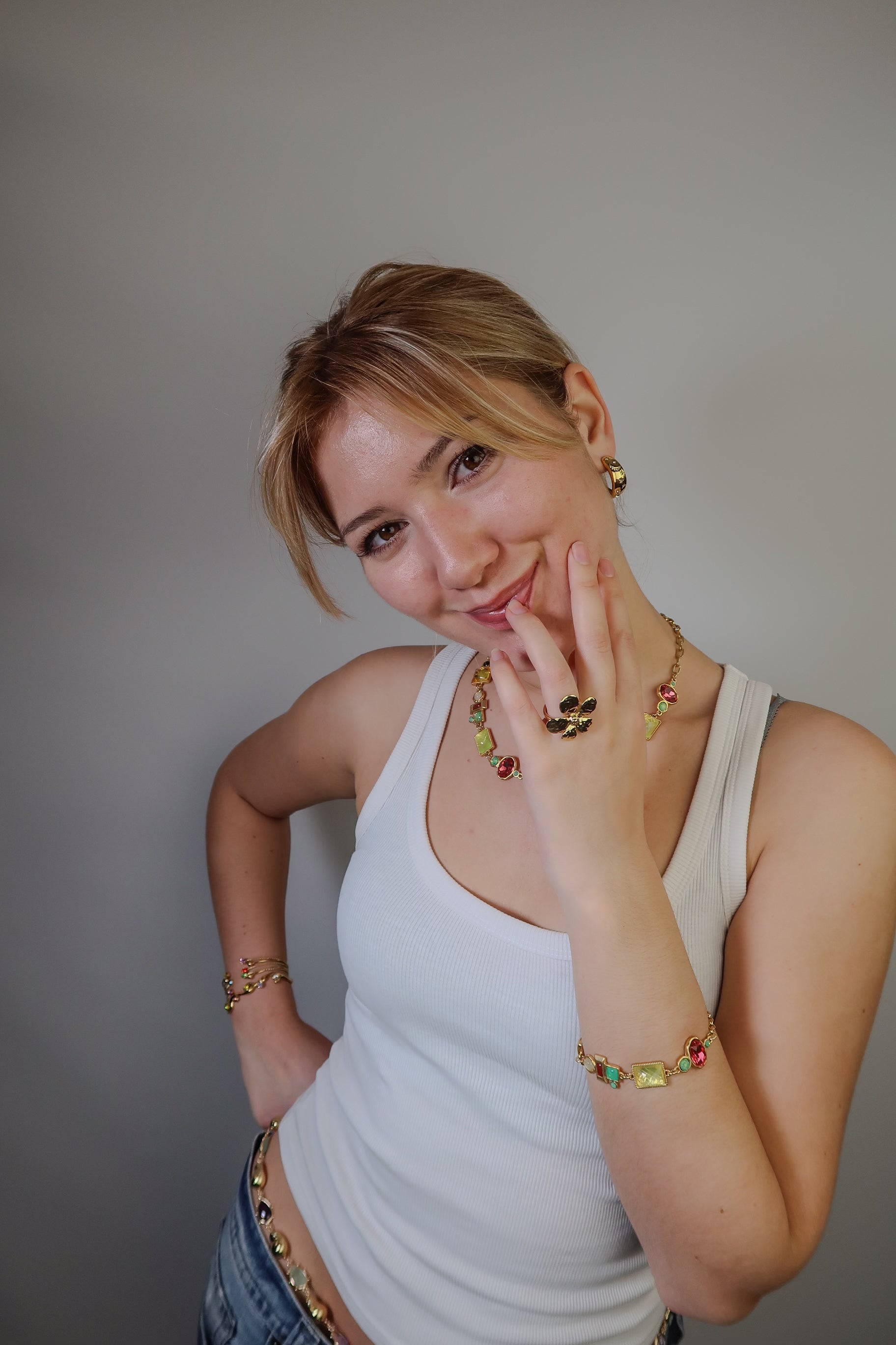 Tamara's charm bracelet is a vintage inspired gold bracelet featuring asymmetrical, vibrantly coloured stones. This maximalist bracelet is the perfect statement piece that can make any outfit shine.