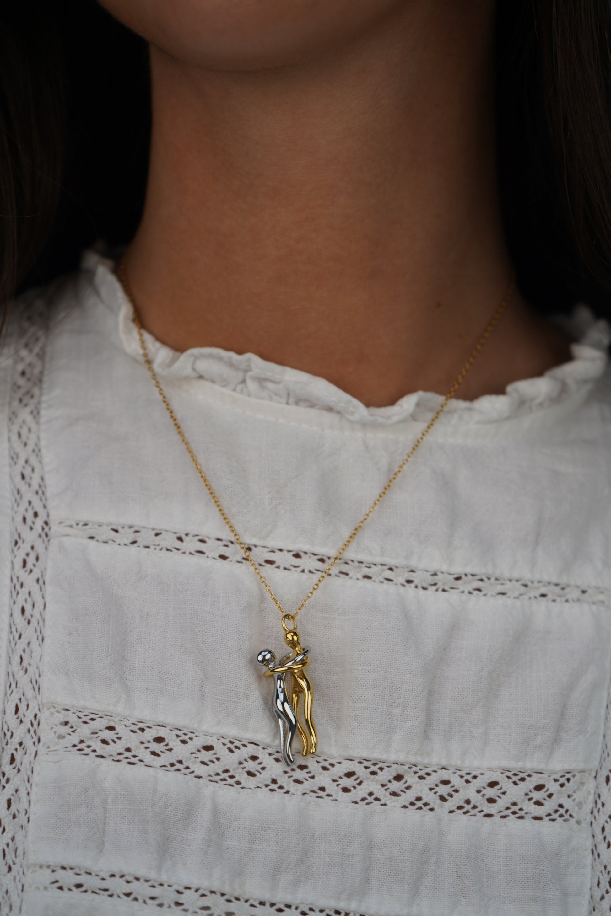 Taylor's love necklace is a unique pendant necklace with two entwined figures in gold and silver tones. This necklace comes on a gold chain. This is perfect for those who like mixing gold and silver.
