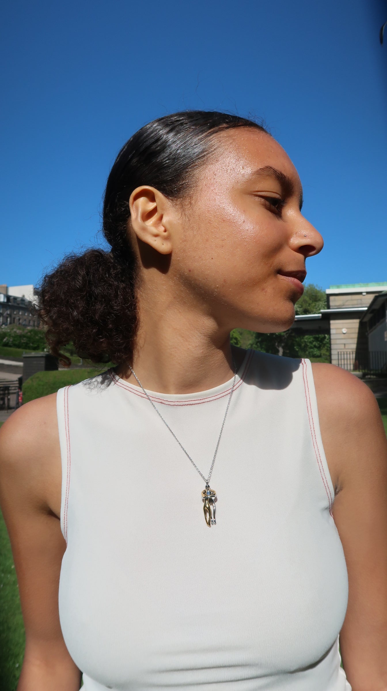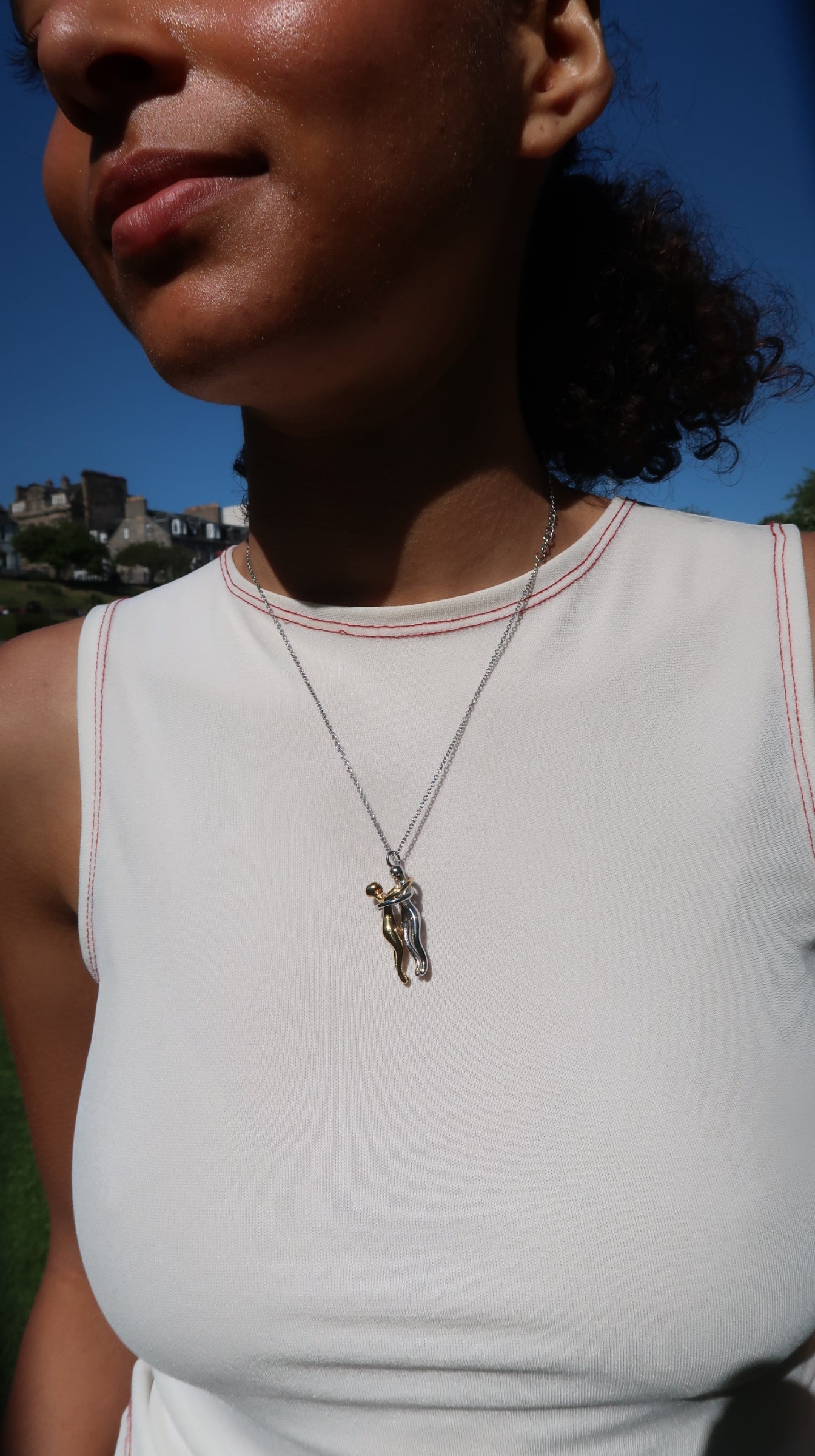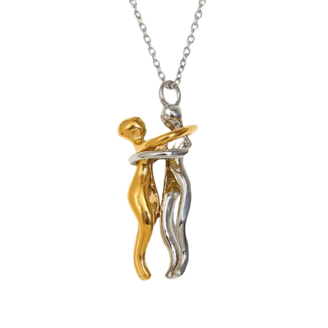 Taylor's mixed necklace is a unique pendant necklace with two entwined figures in gold and silver tones. This necklace comes on a silver chain. This is perfect for those who like mixing gold and silver.