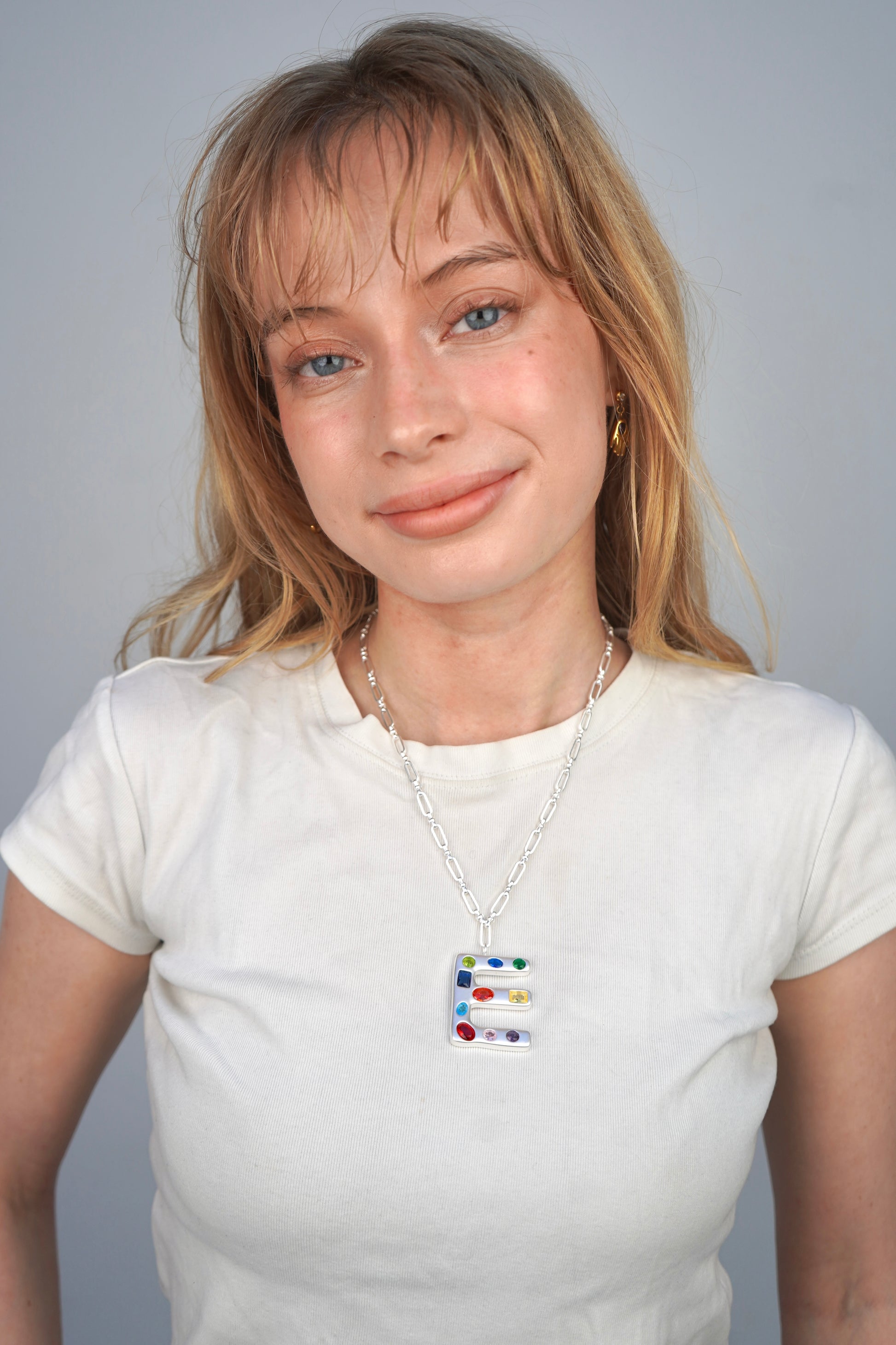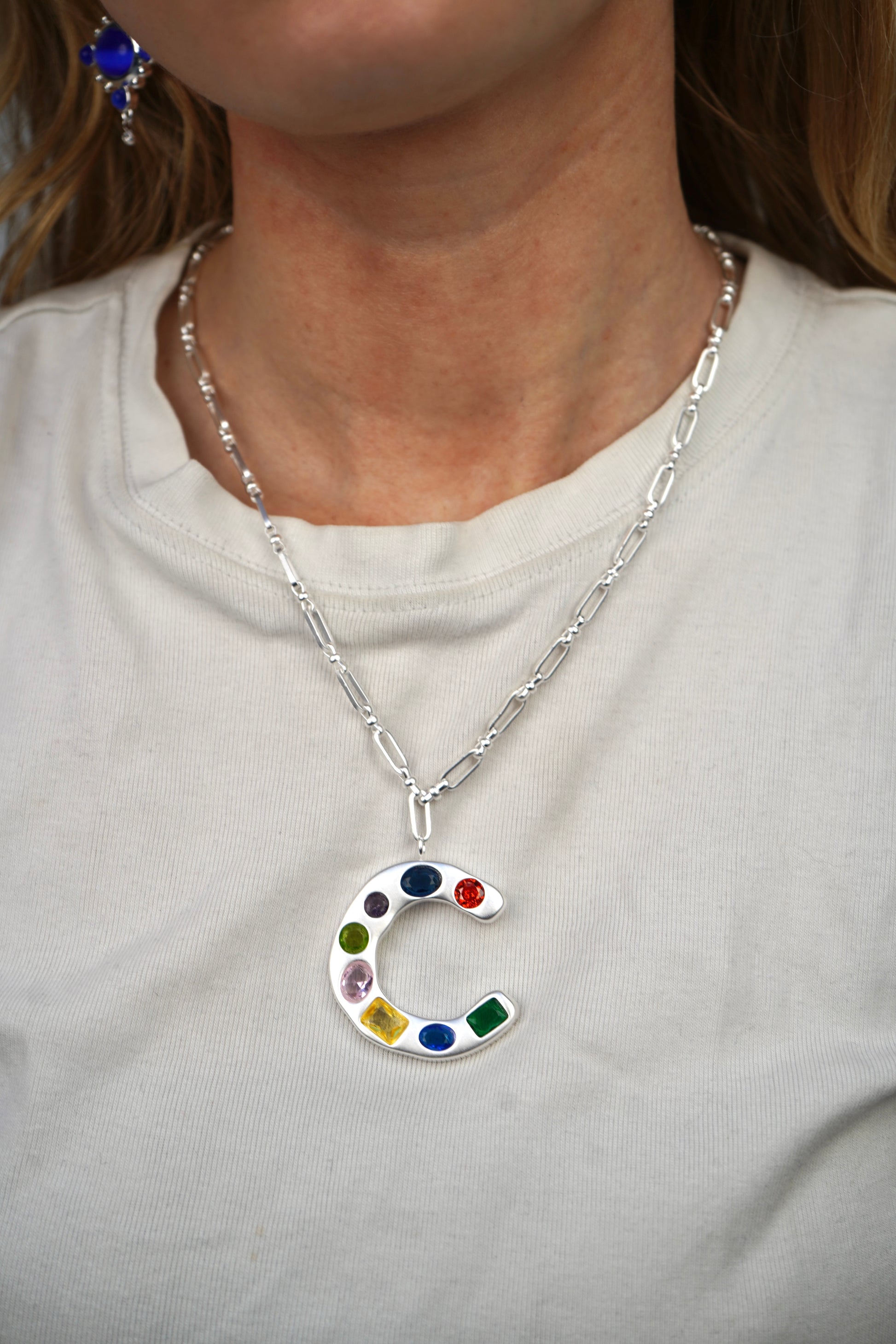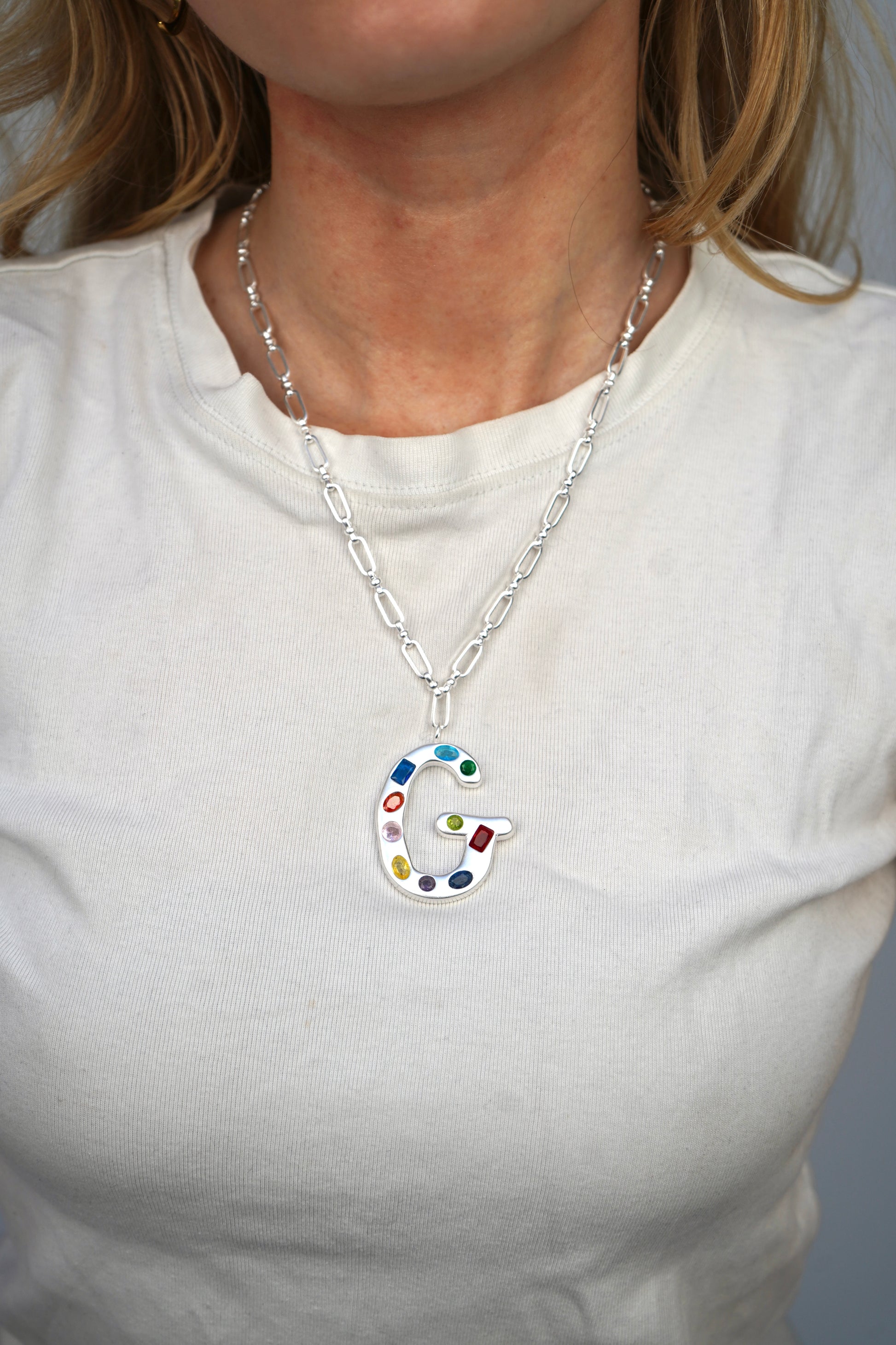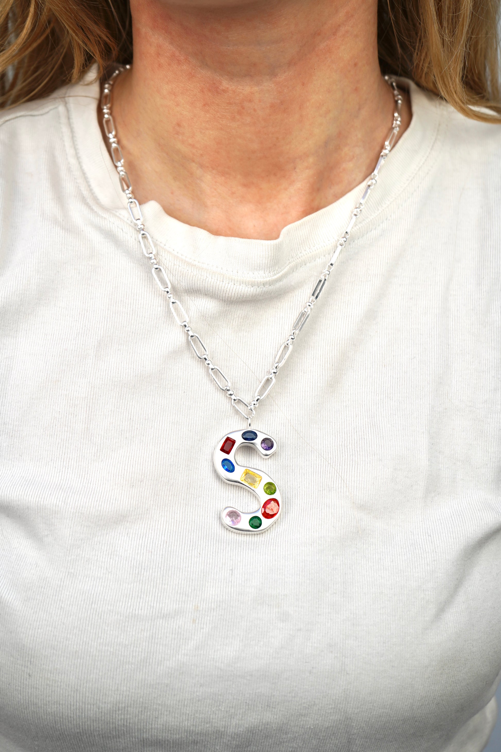 The gemstone alphabet pendant in silver is a silver statement necklace with a chunky letter charm embellished with colourful gemstone accents. This is the perfect meaningful yet elegant statement piece to complete any look.