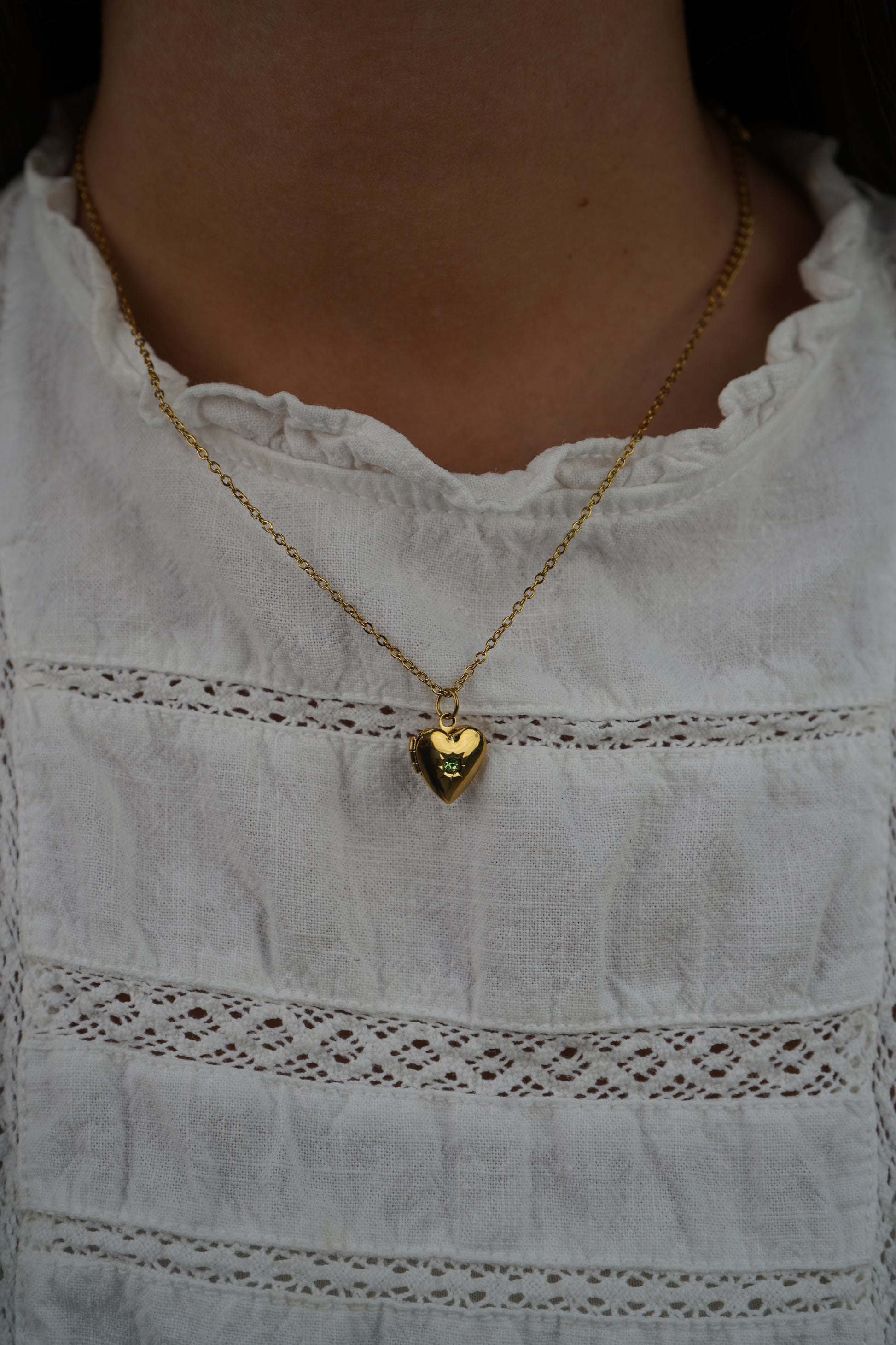 Tiana's light green heart locket is a small heart-shaped locket with a single light green gemstone accent. This locket opens and closes, making it the perfect place to keep a tiny photo or keepsake.