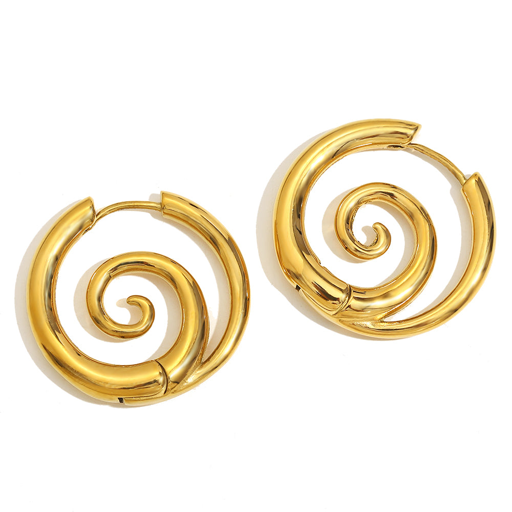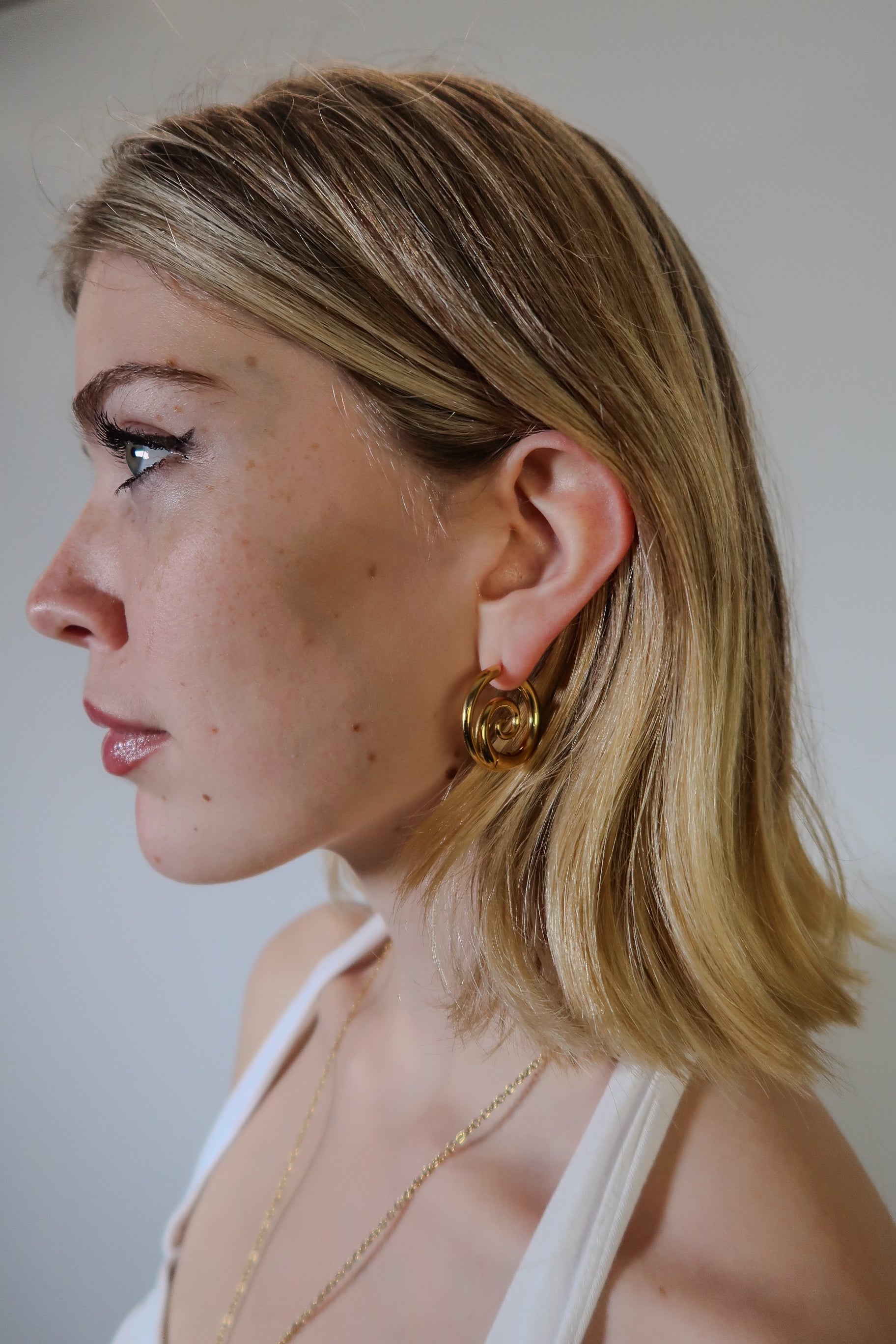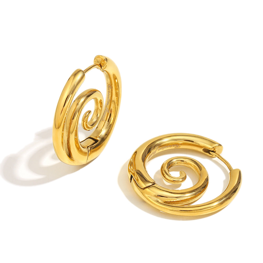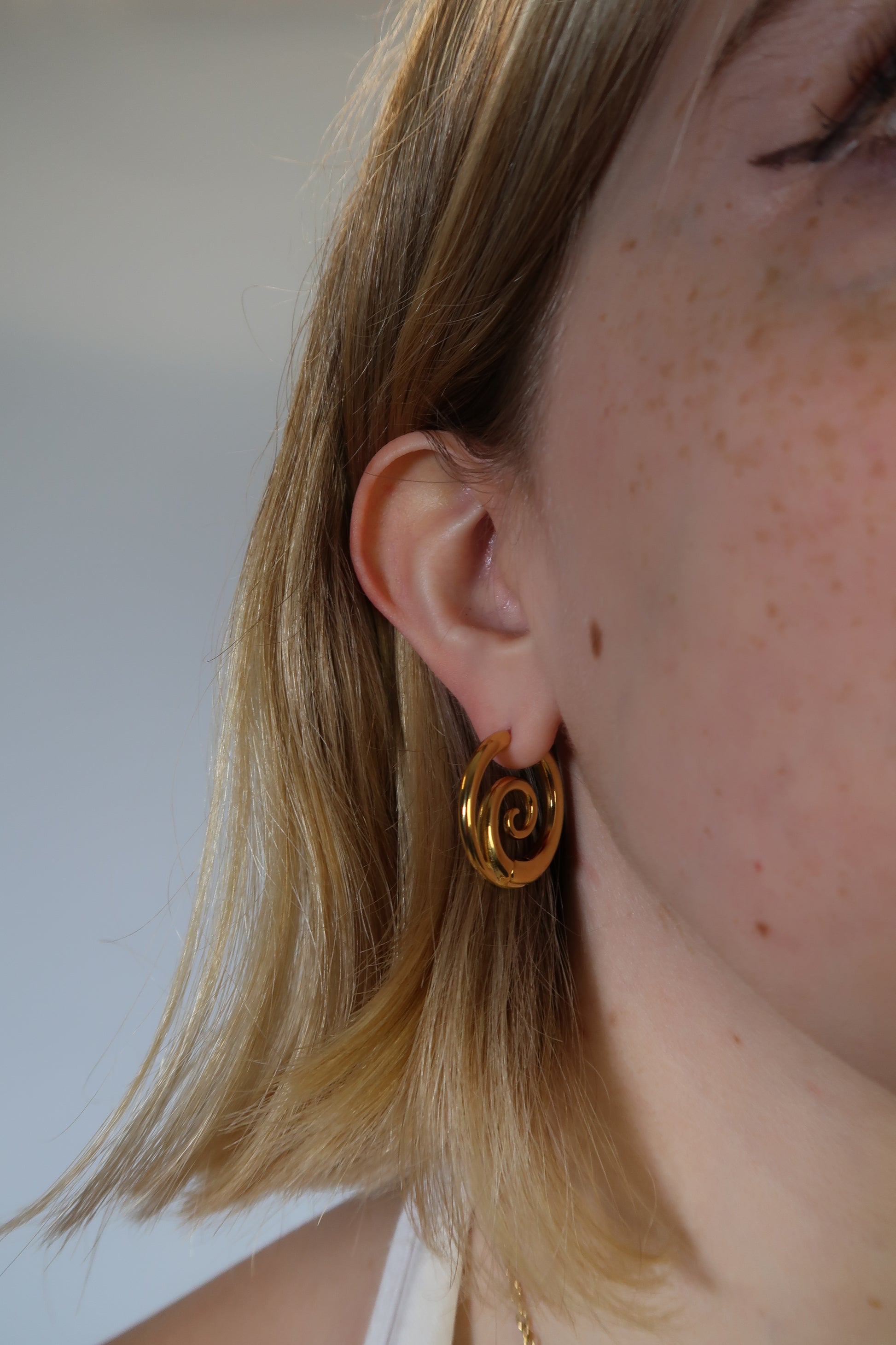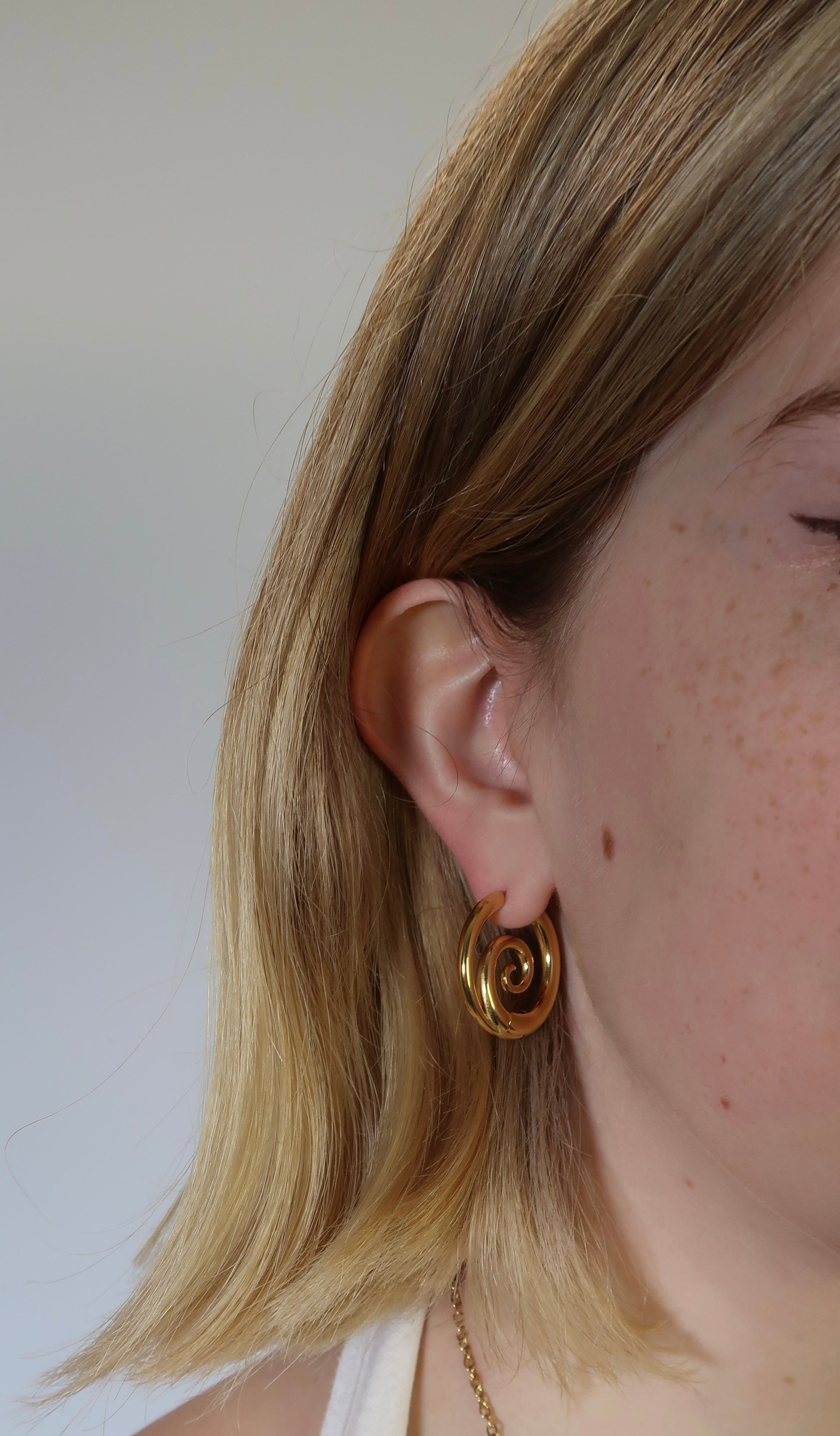 Tilly’s gold swirl earrings are medium sized gold hoop earrings with a beautiful swirl design. These earrings are waterproof, hypoallergenic, and perfect for everyday wear.