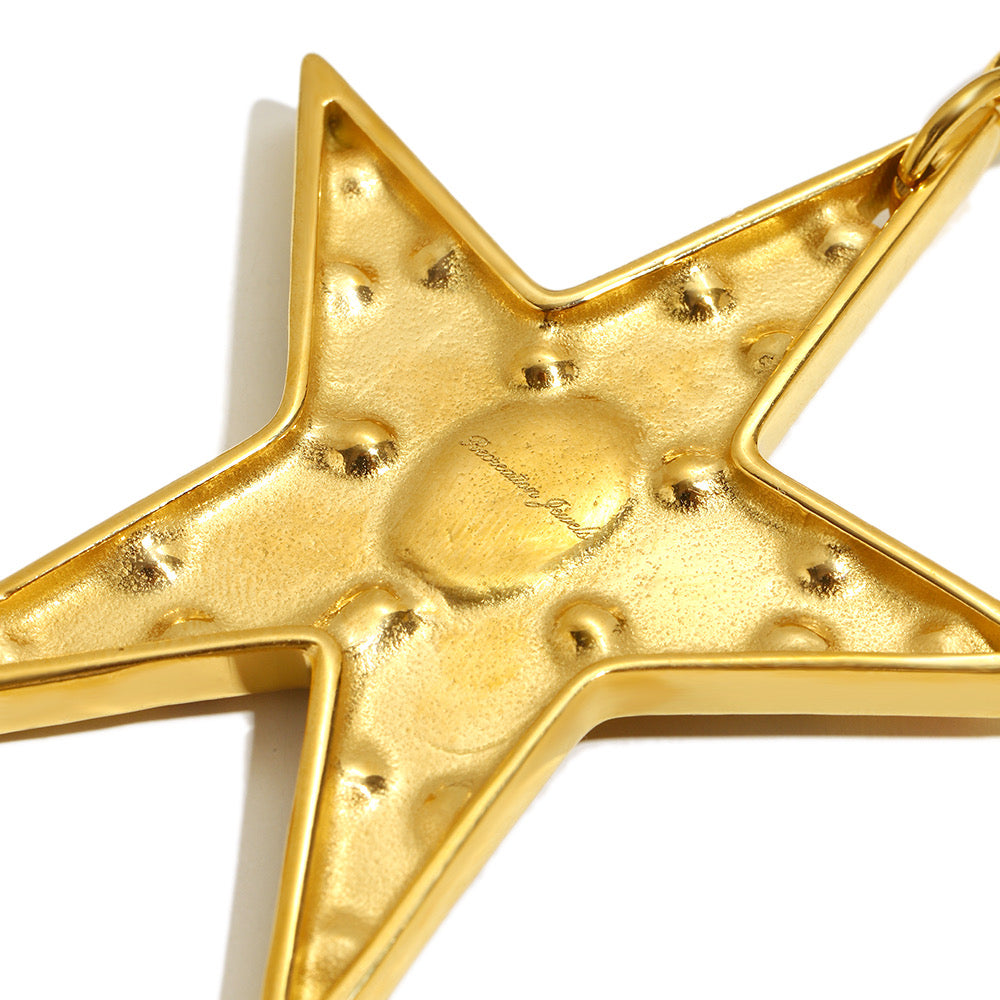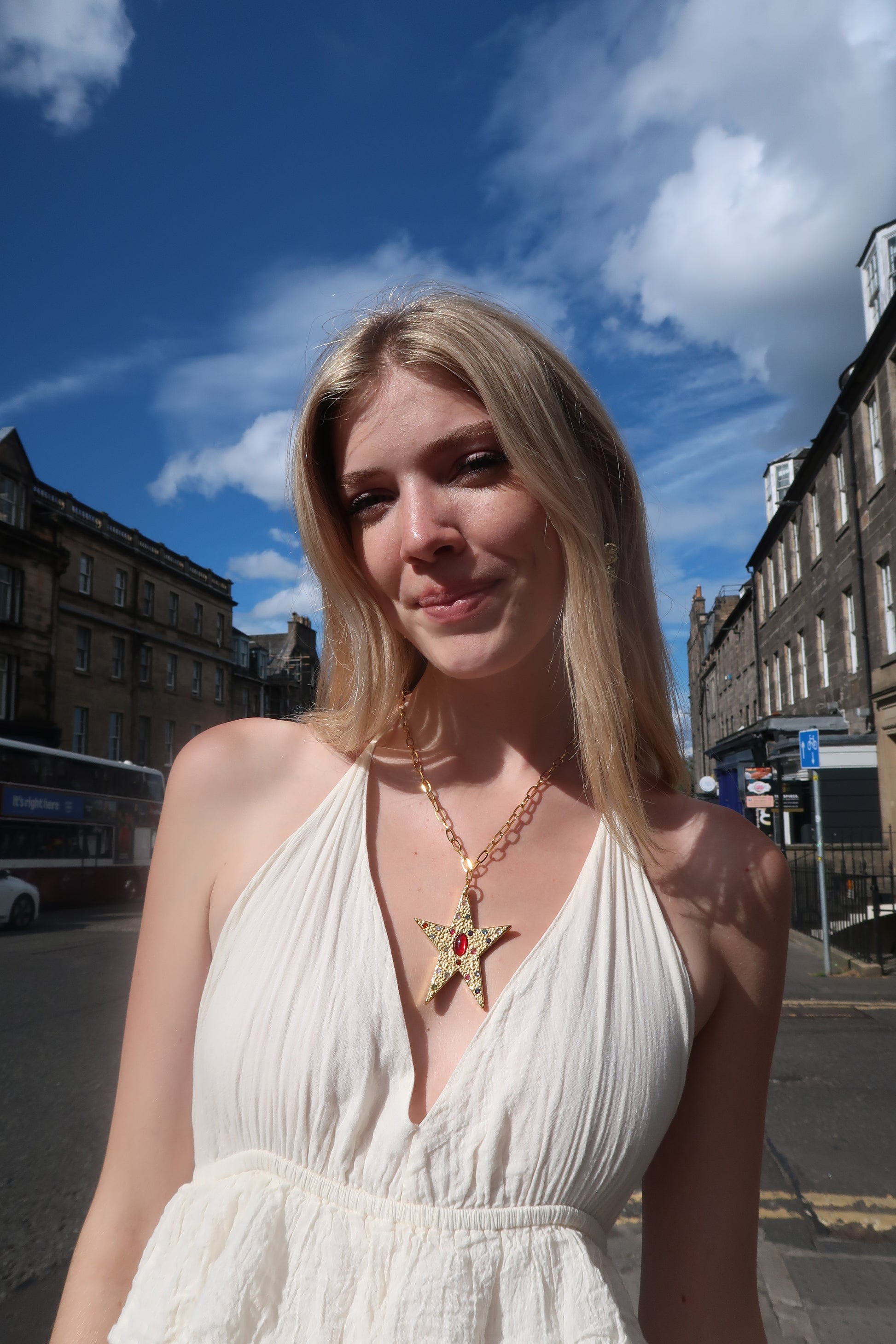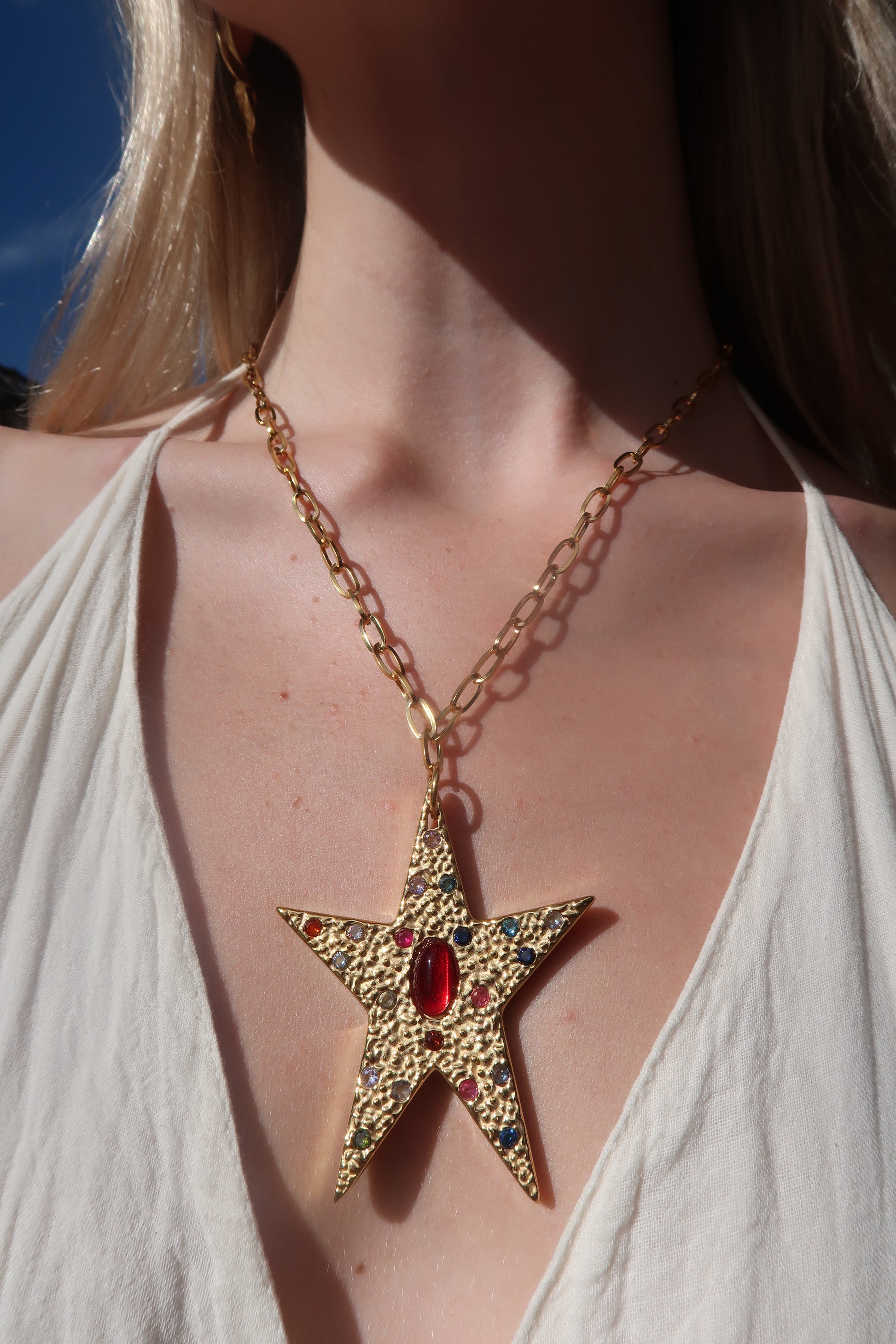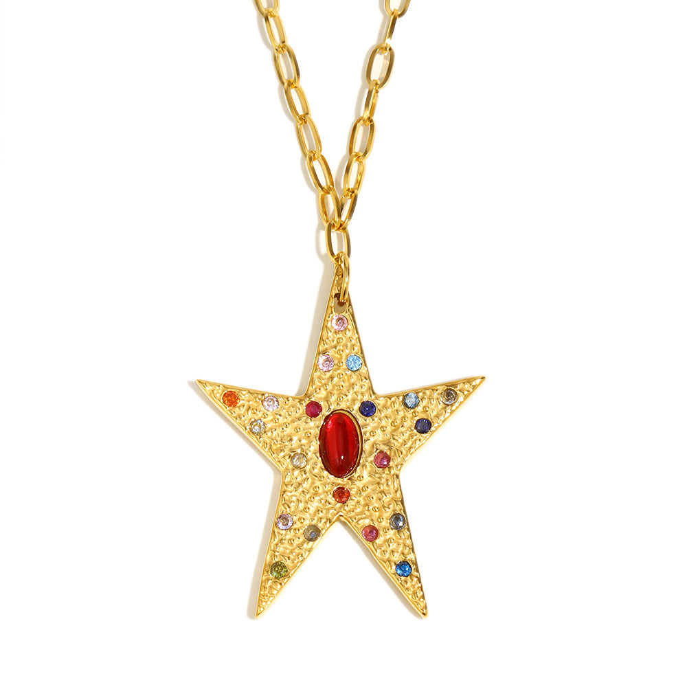 Amara’s star pendant is a large star shaped pendant necklace with a bright red gemstone at the center and multicoloured gemstone accents surrounding it. This is perfect as a statement piece or to wear in a maximalist stack.