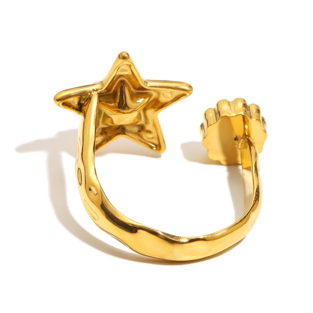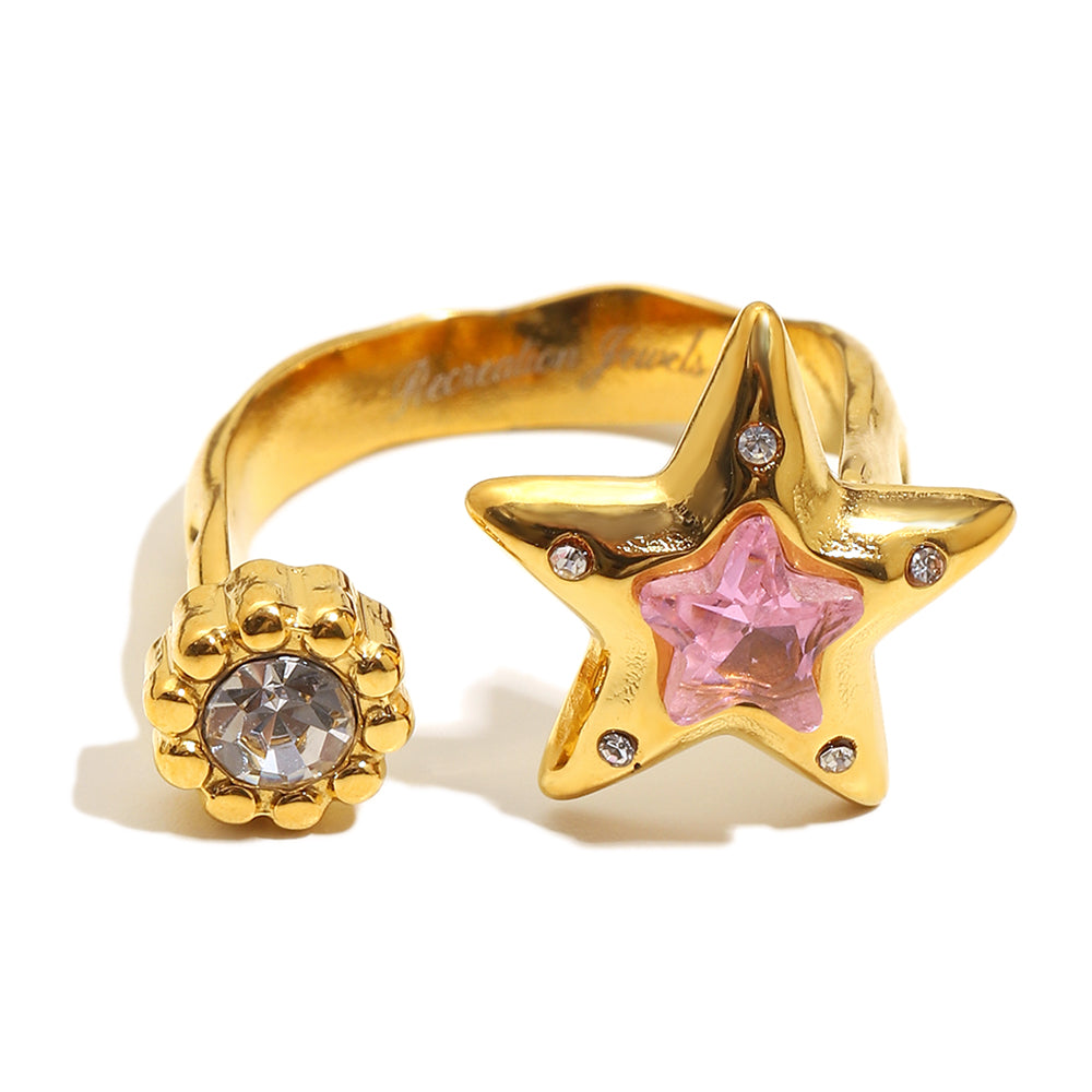 Verity's pink star ring is a gold ring with a star shaped pink gemstone on one side and a round clear gemstone on the other side. This is the perfect ring to add to a maximalist stack.