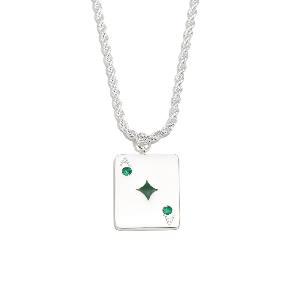 Vesper's ace of diamonds necklace in silver is a simple silver necklace featuring a small pendant in the shape of an ace of diamonds. This necklace is the perfect playful yet elegant piece to pair with any look.