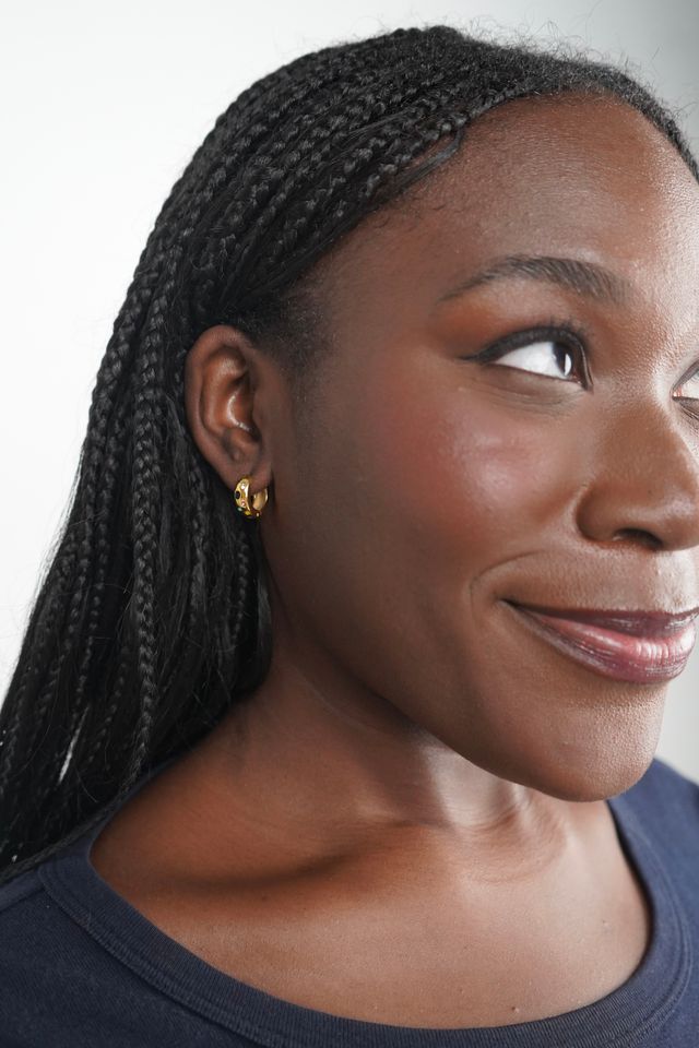 Victoria's Multicoloured Hoops are gold huggie hoops with embedded multicolored gemstones. The vibrant gemstones add a pop of color to any outfit.