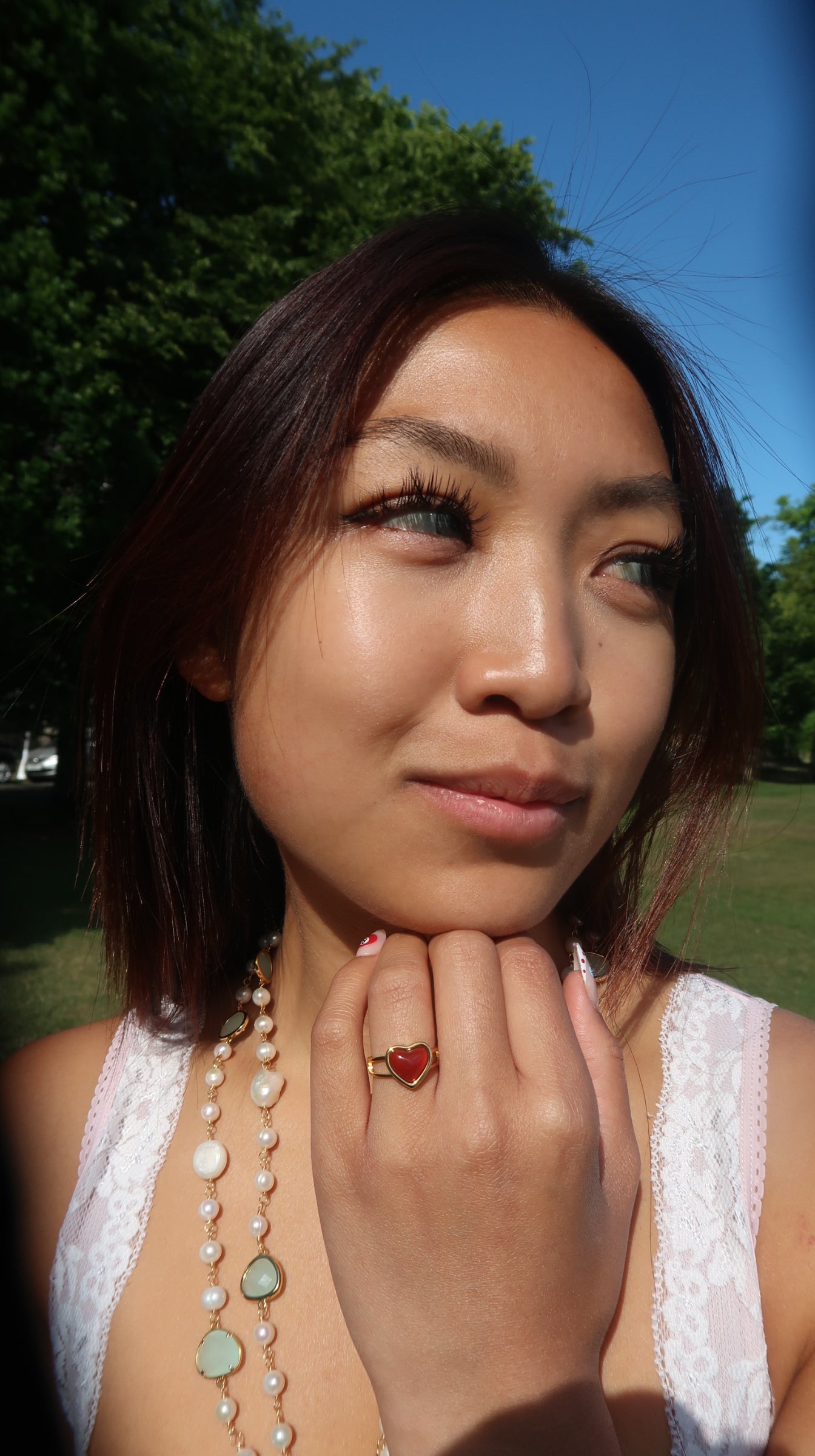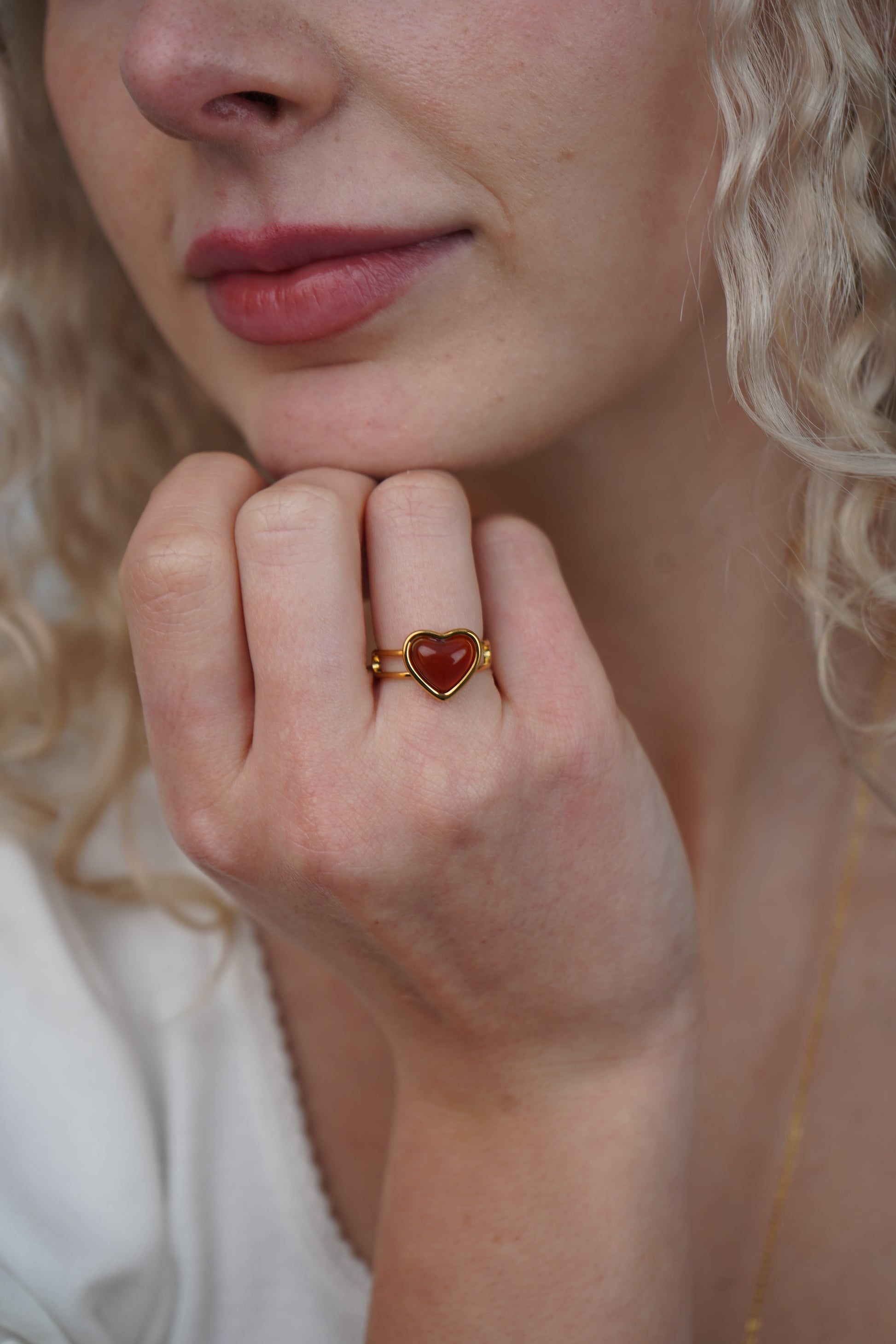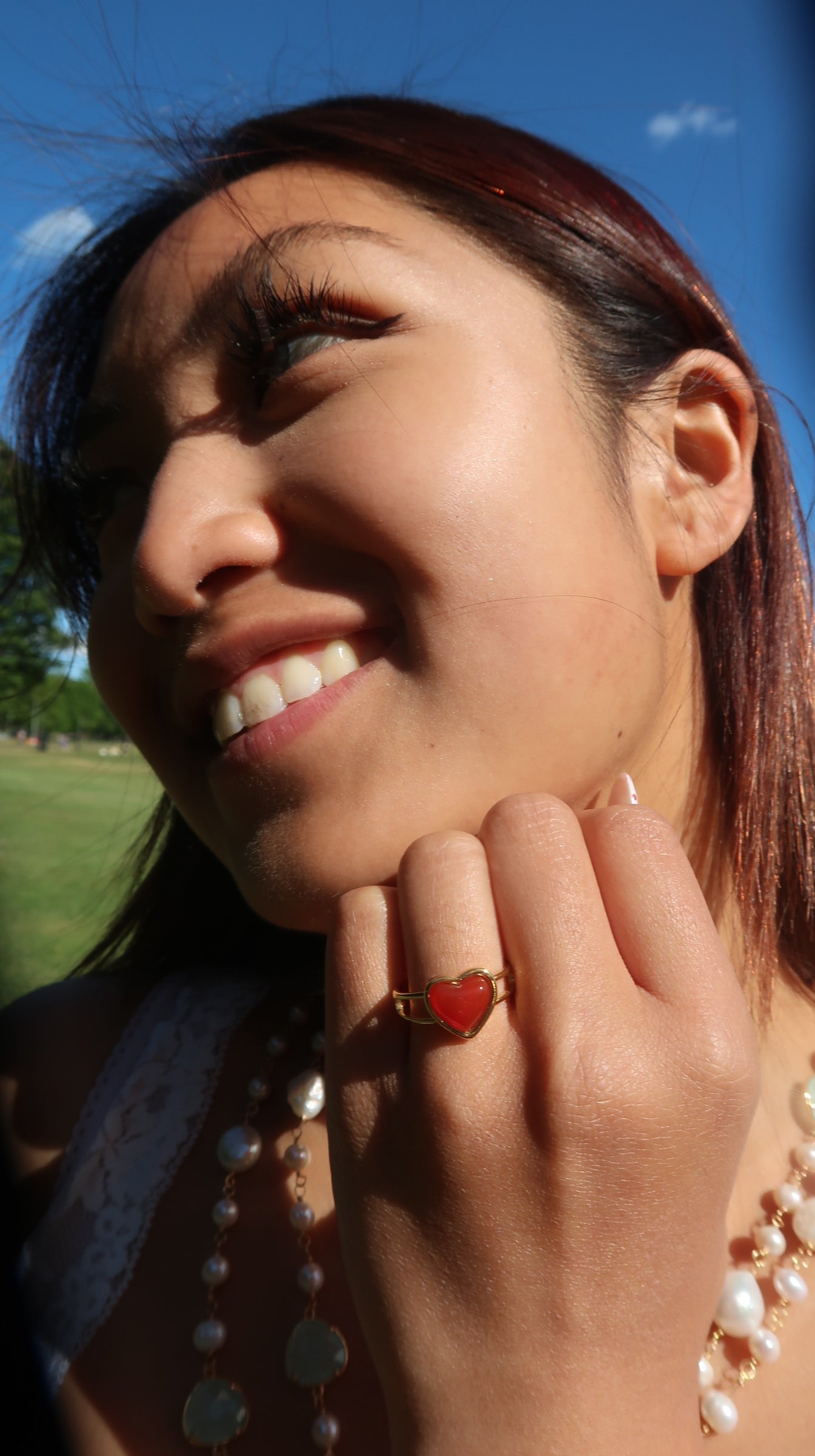 Viola's heart ring is an a adjustable ring that features a unique red heart gemstone in the center.