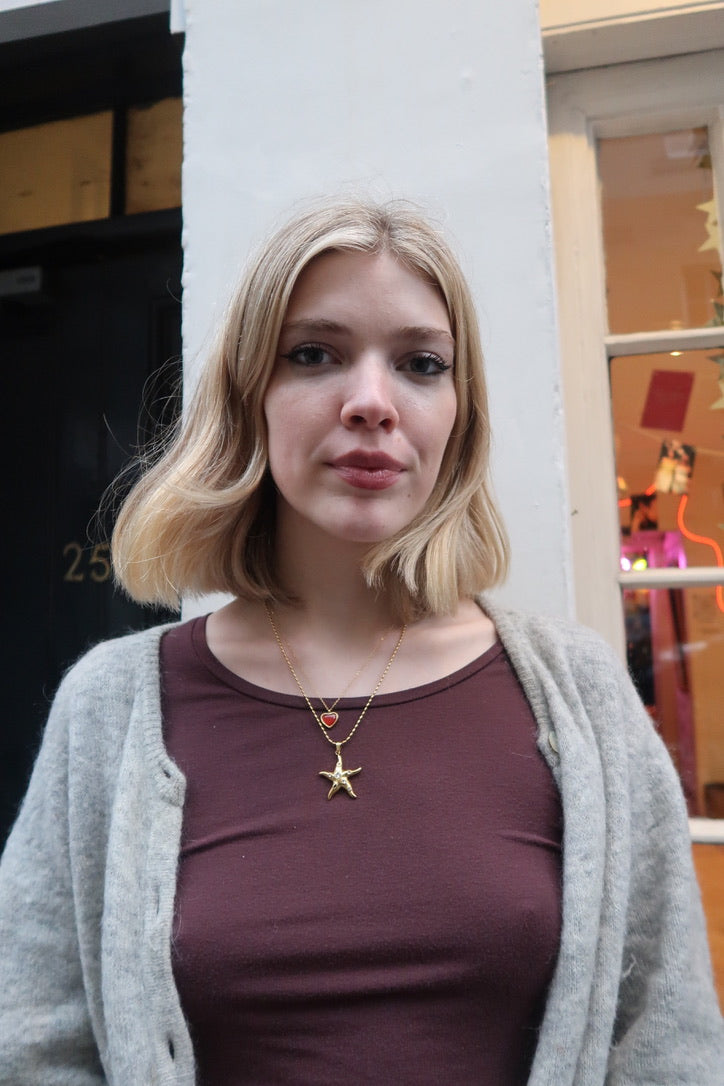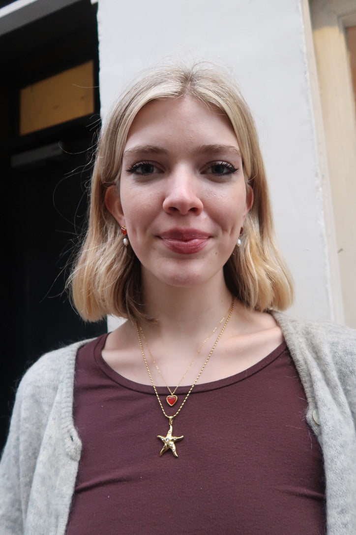 Viola's necklace is a dainty heart pendant necklace with a thin, elegant gold chain. This necklace is the perfect minimalist piece to add a pop of colour to any look.