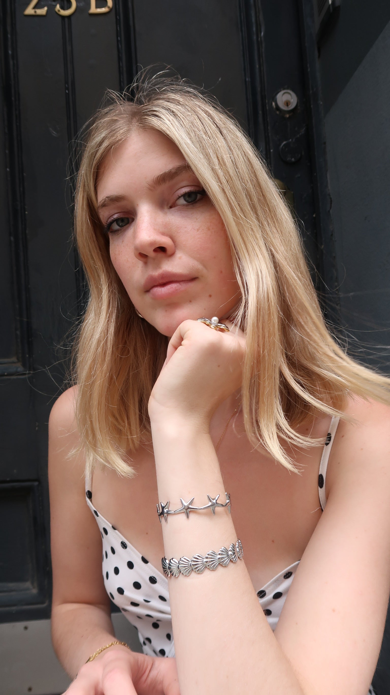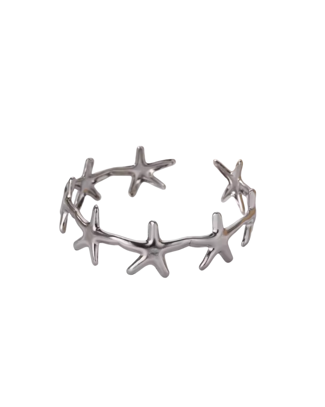 Violet’s Star Bangle is a bold, sculptural piece featuring a constellation of golden starfish. With its open design and organic shape, it’s the perfect statement bangle to elevate any summer look.