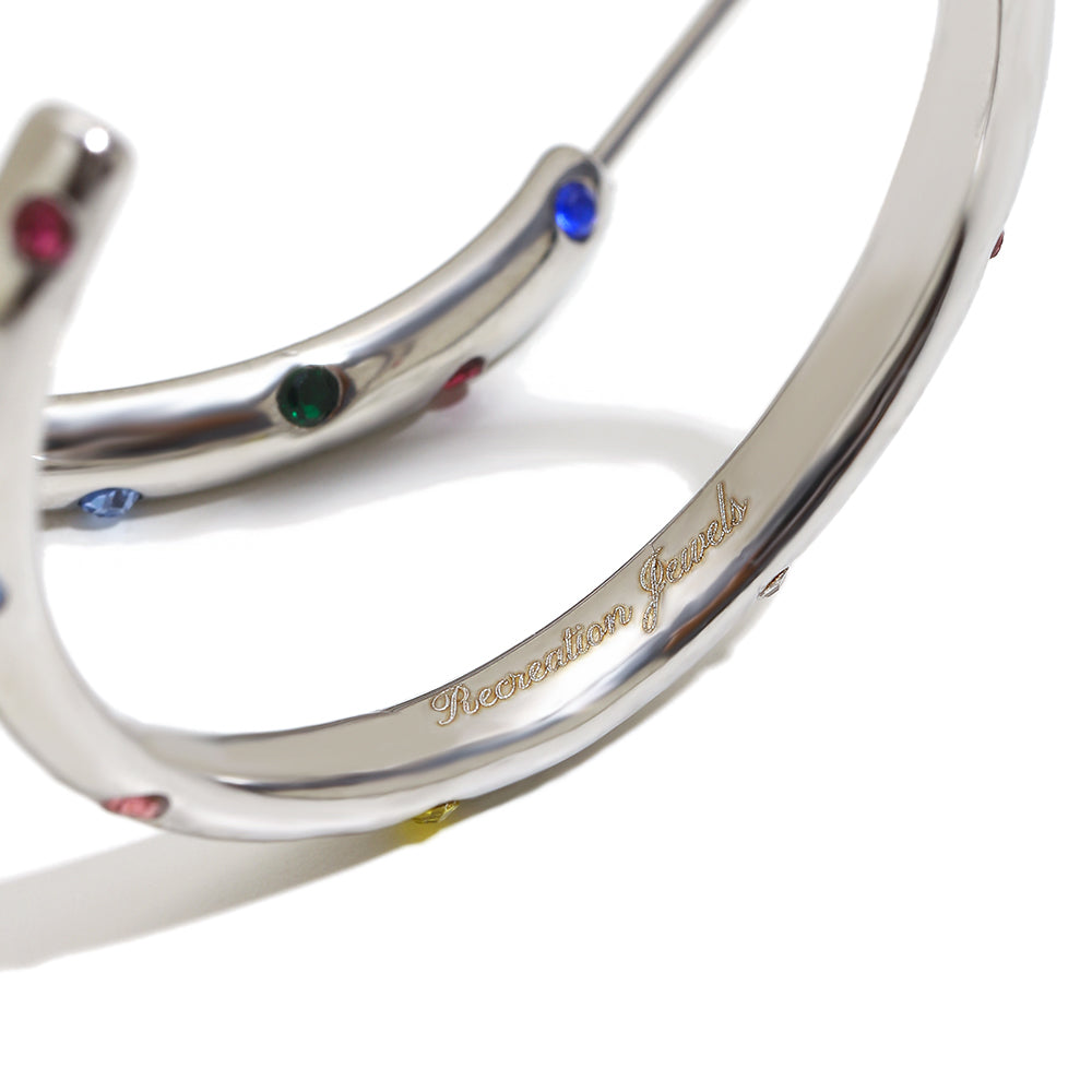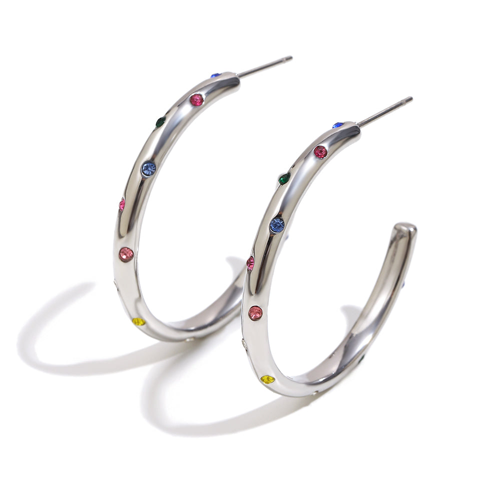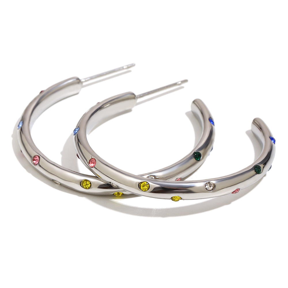 Zoe's gemstone hoops are large, thin, hoop earrings accented with blue, pink, green, and white gemstones. These earrings are the perfect simple yet bold piece to complete any look.